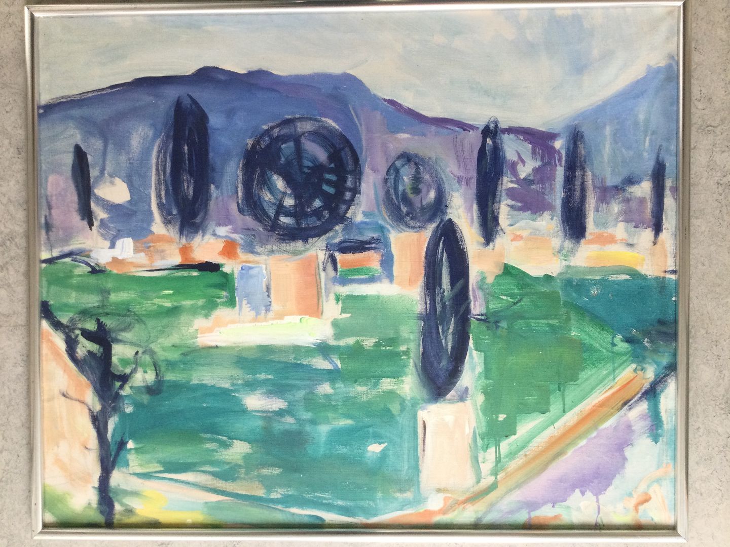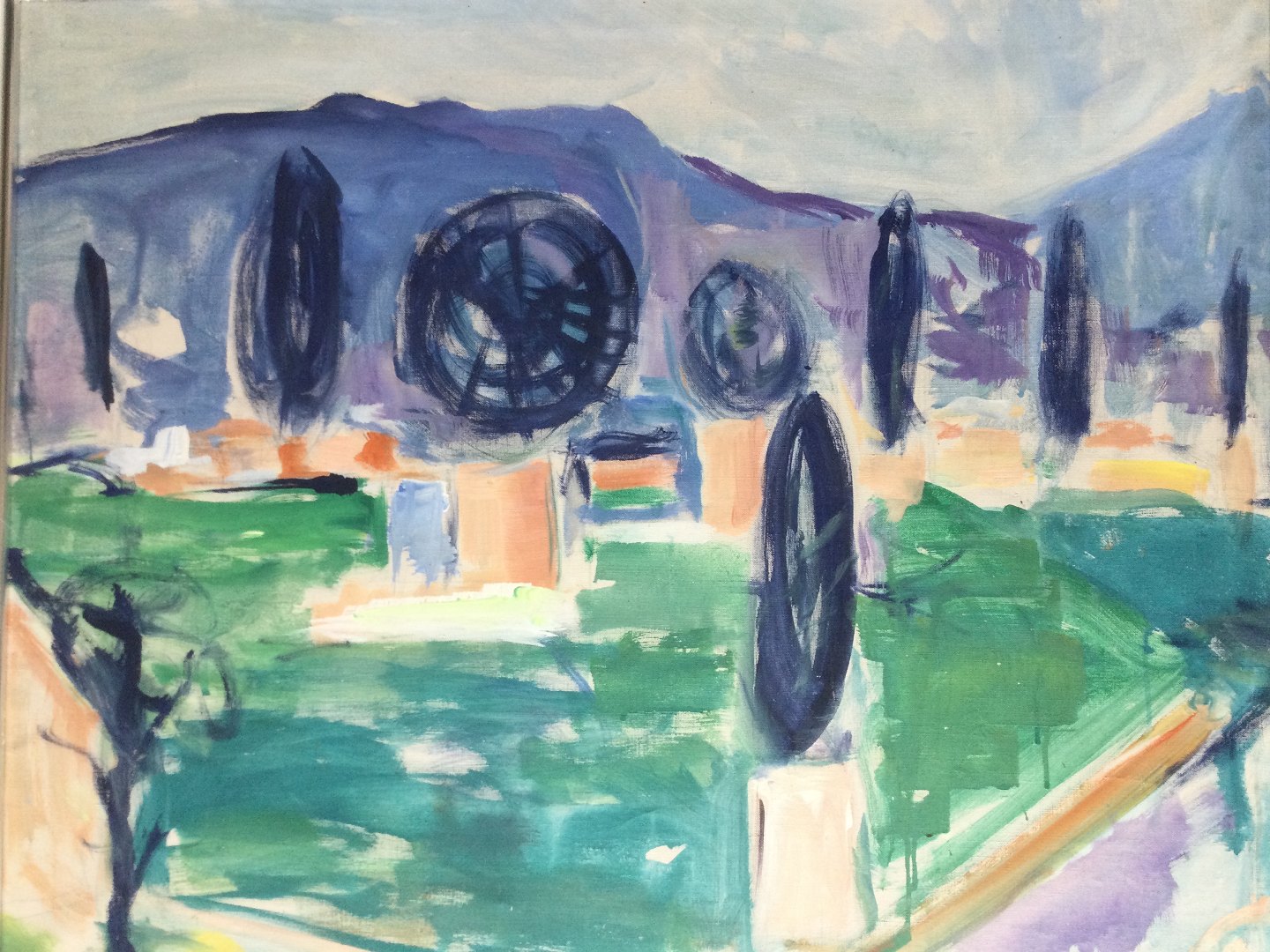 Maleri - Landskab med cypresser og Pariserhjul.
