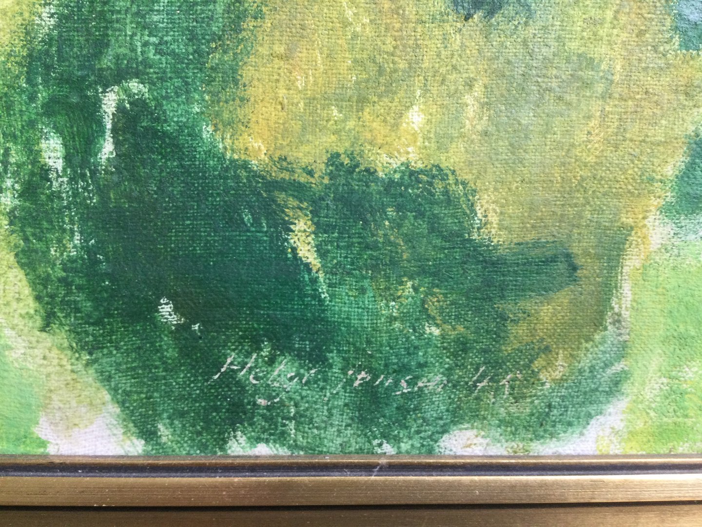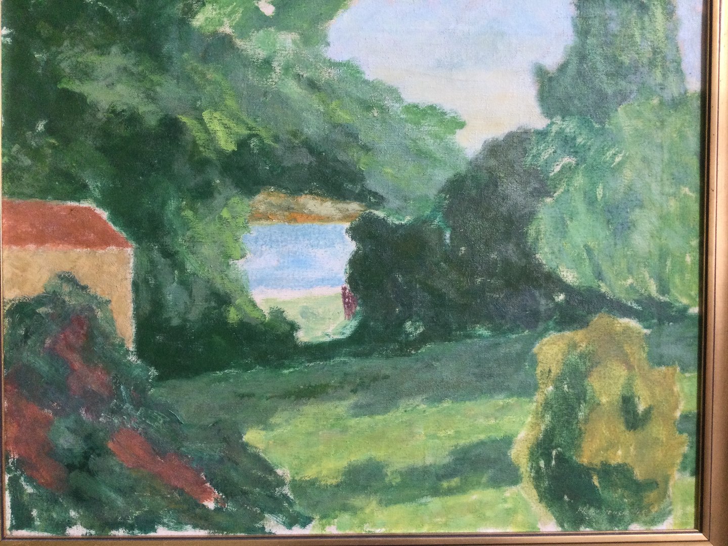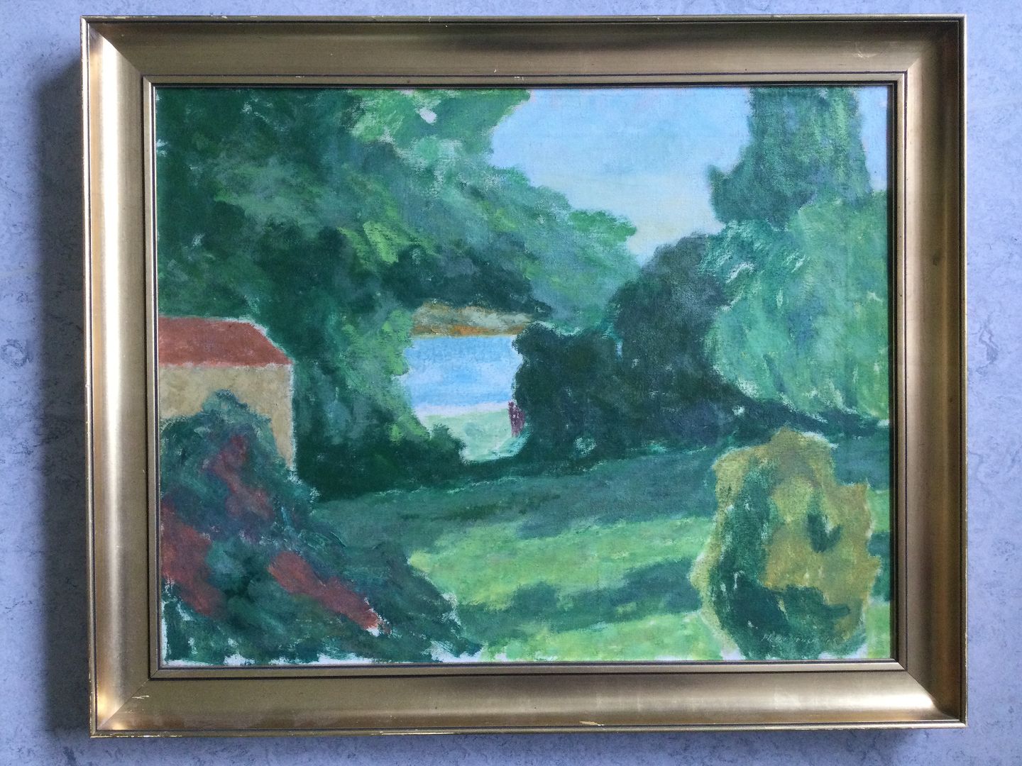 Maleri af Helge Jensen - Haveparti med sø 1945.