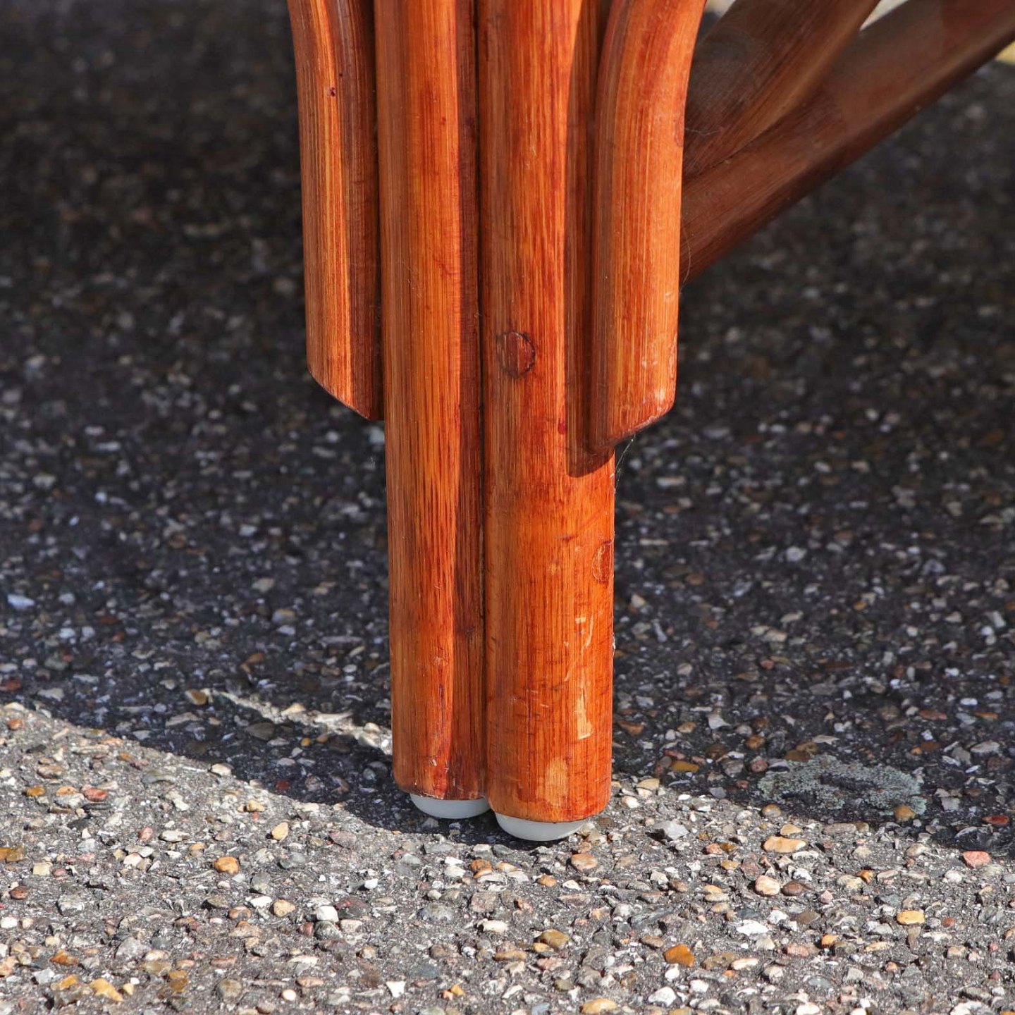 Tre personers sofa i mørk lakeret bambus med flettede sider og skumhynder betrukket med struktureret gult stof. Betrækket er lettere solfalmet.