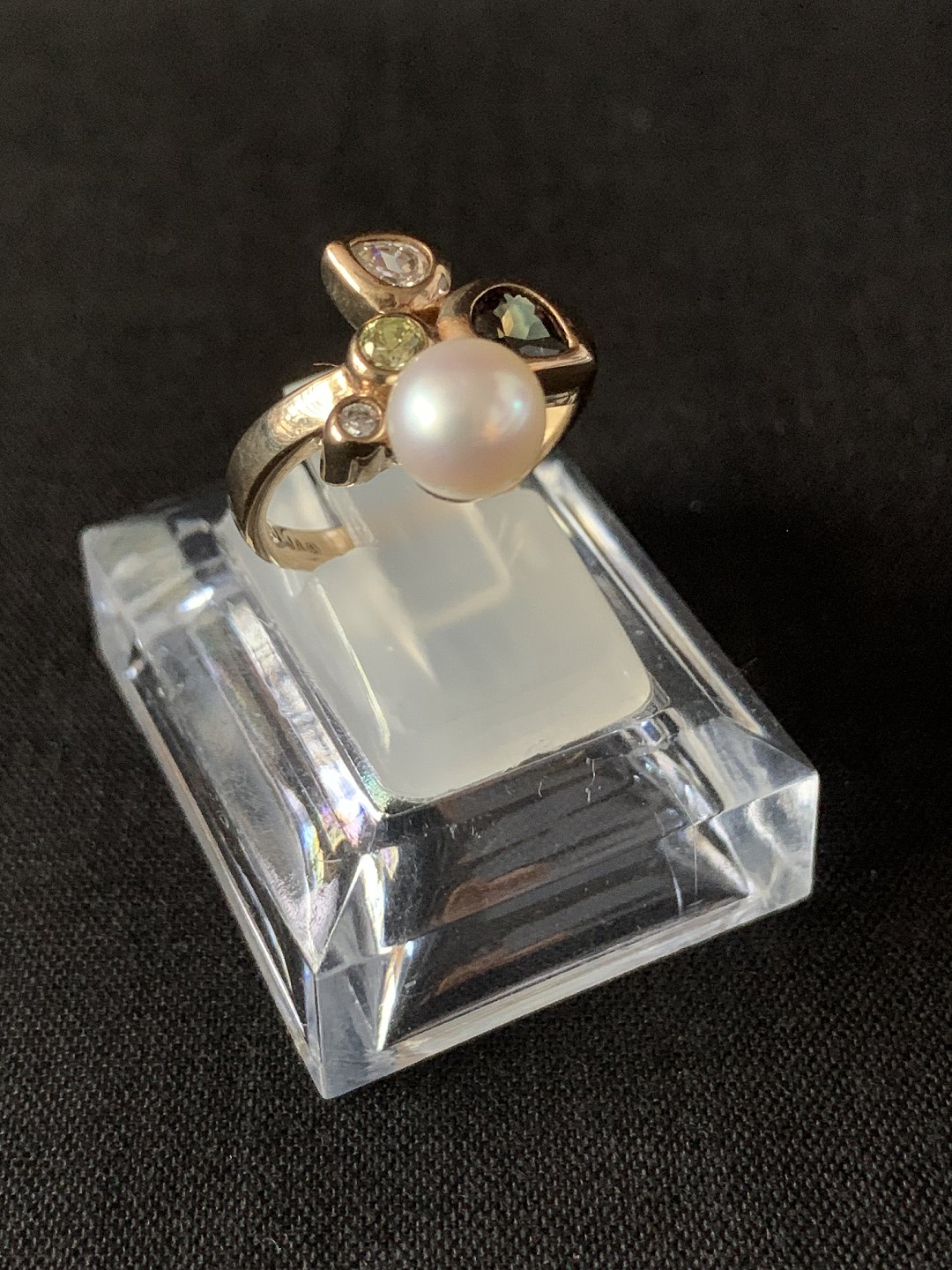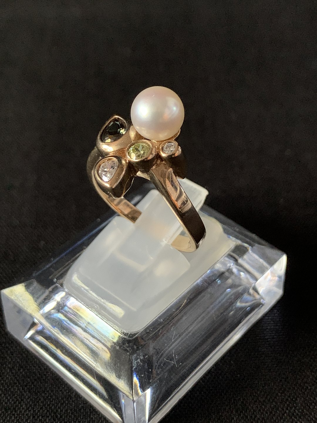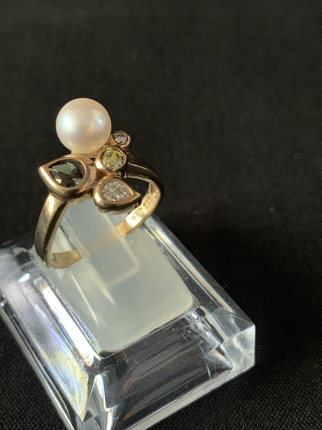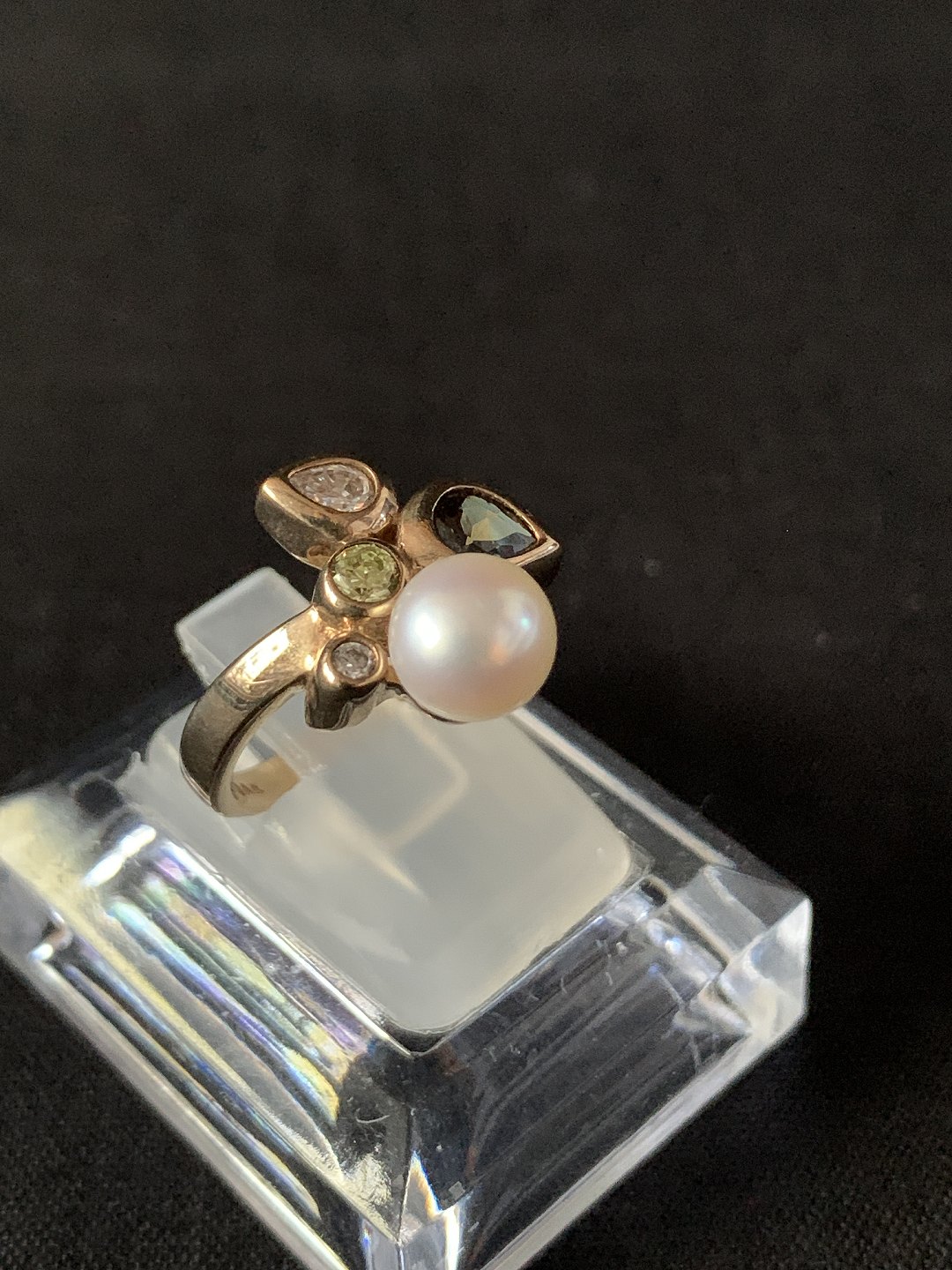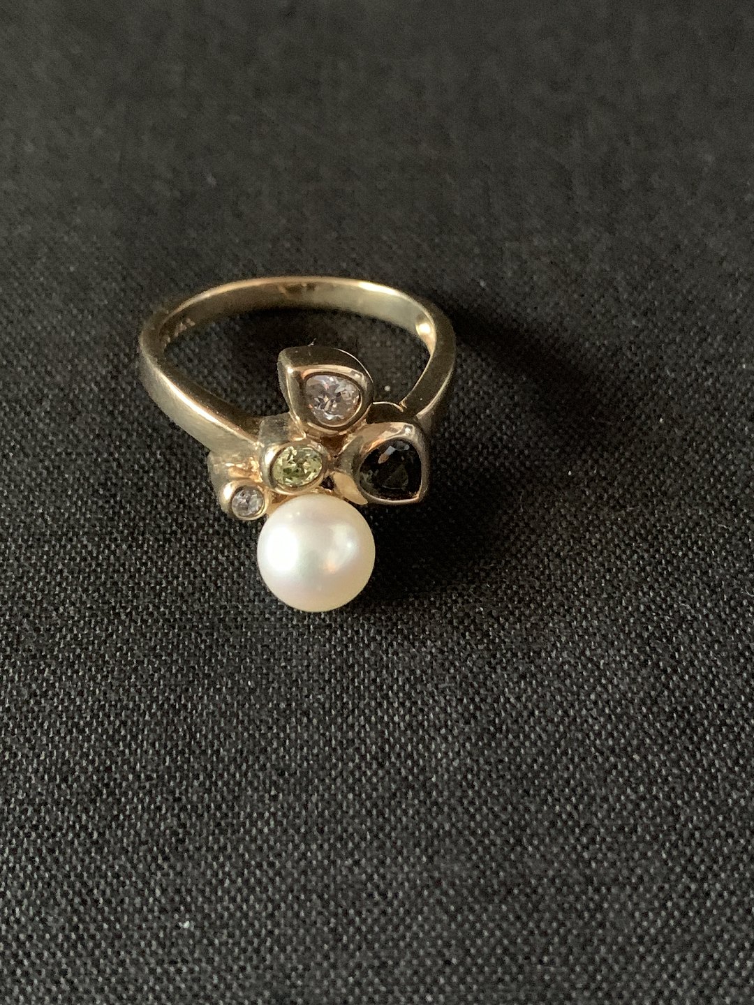 Damering i 8 karat guld, med indlagt ægte perle samt sten.