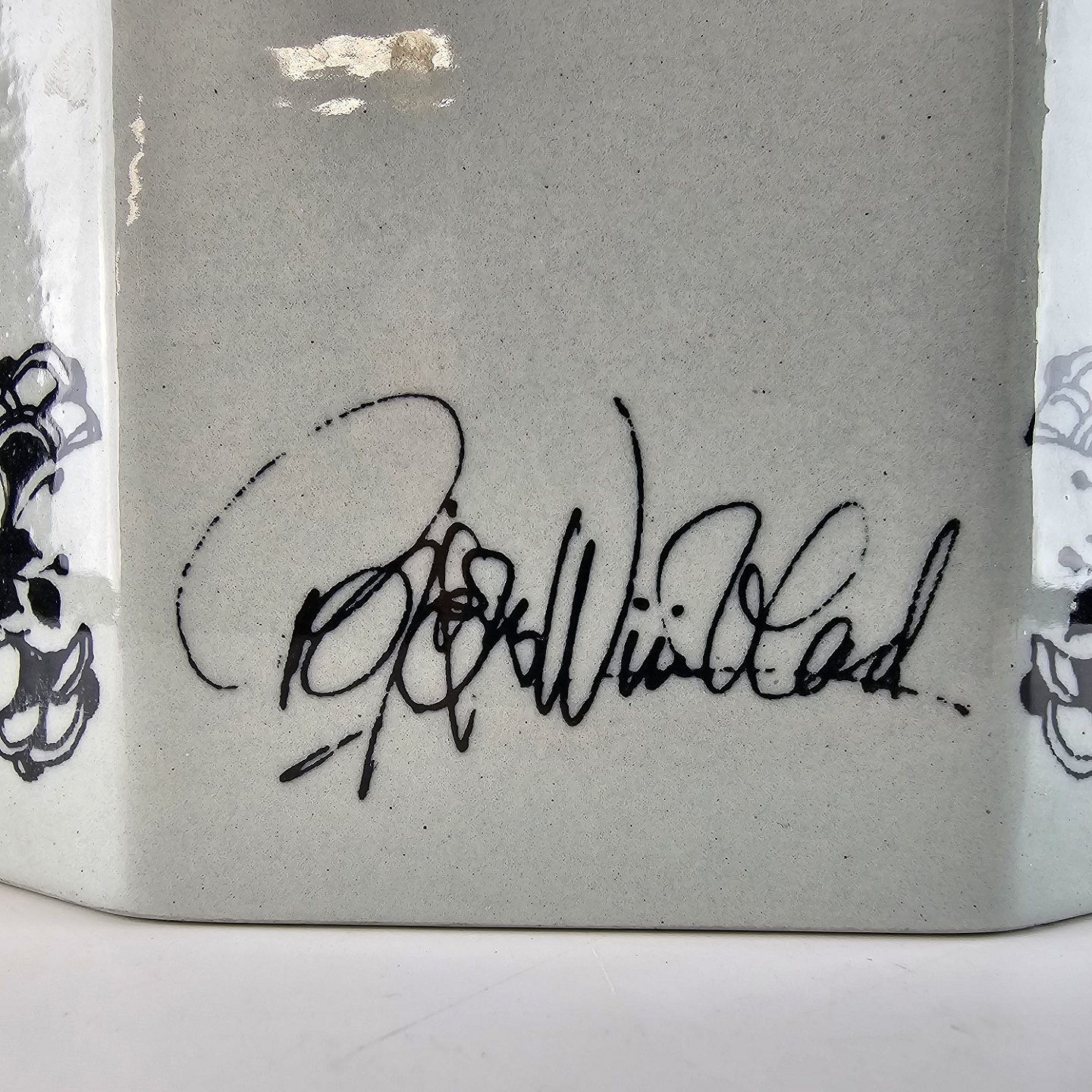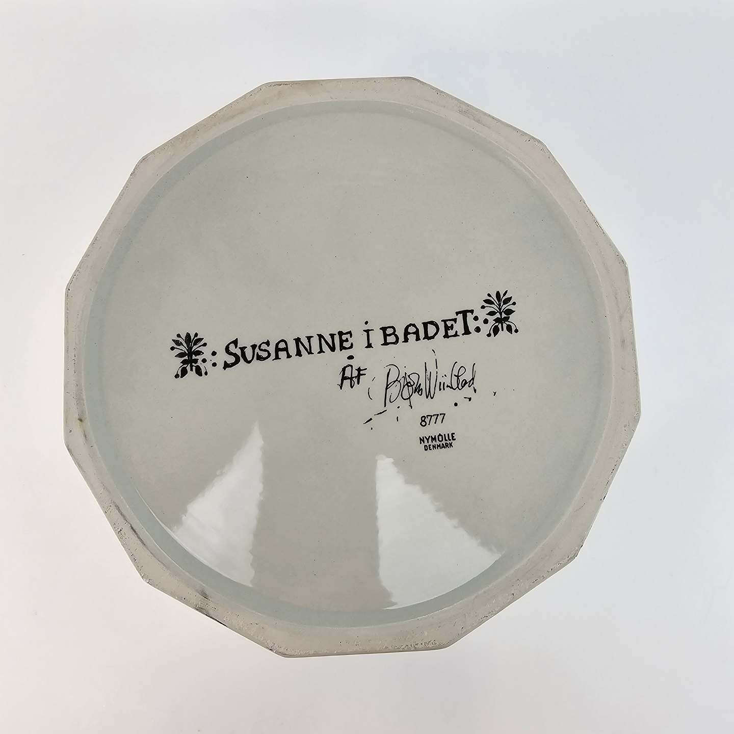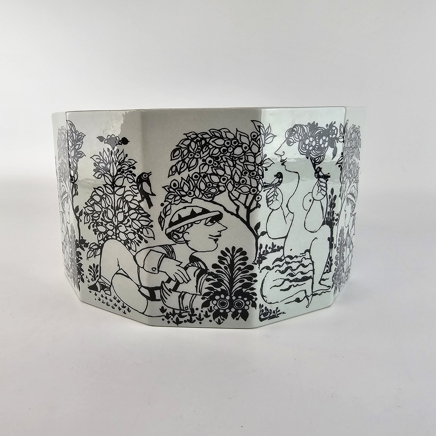 Urtepotteskjuler eller skål af keramik med de klassiske sort/hvide motiver. Denne er af en kvinde som bader og mænd som kigger på.