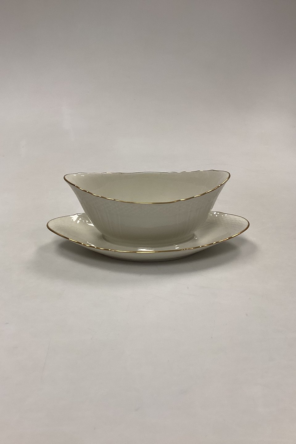 Royal Copenhagen Creme Svejfet med Guld (Stel 1235) Sovseskål No. 1651. Måler 17,5 cm x 9,3 cm / 6,88 in. x 3,66 in. Fast underskål måler 22 cm / 8,66 in.