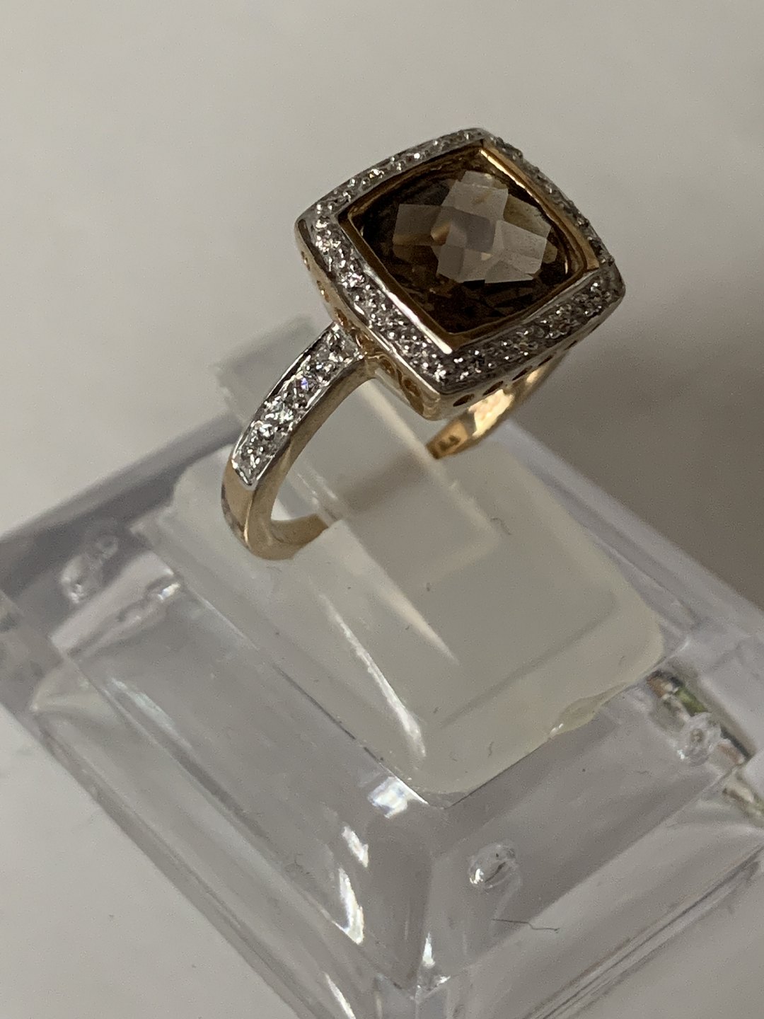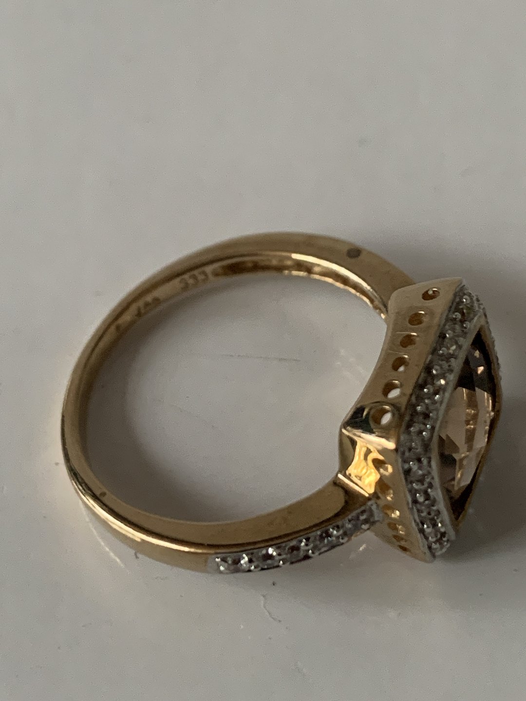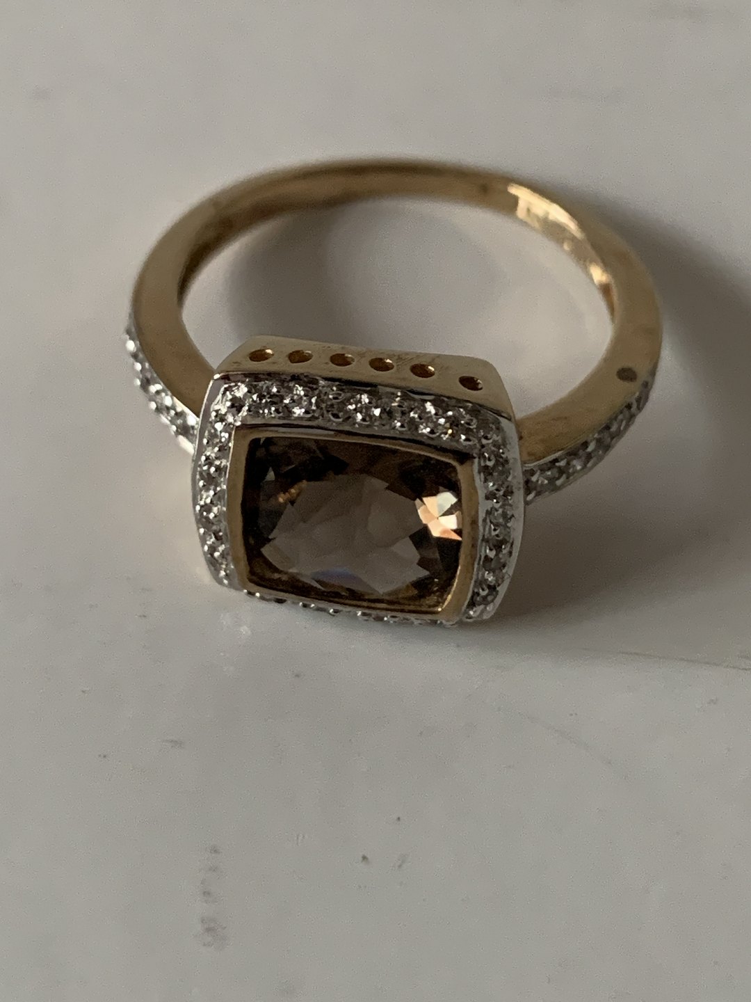 Flot damering i 8 karat guld, med røgfarvet tupas og klare sten. Ringens opbygning er meget elegant, når de klare sten omkranser den store tupas, og samtidig sidder ned langs ringens sider. Dette giver ringen meget dynamik i lyset.