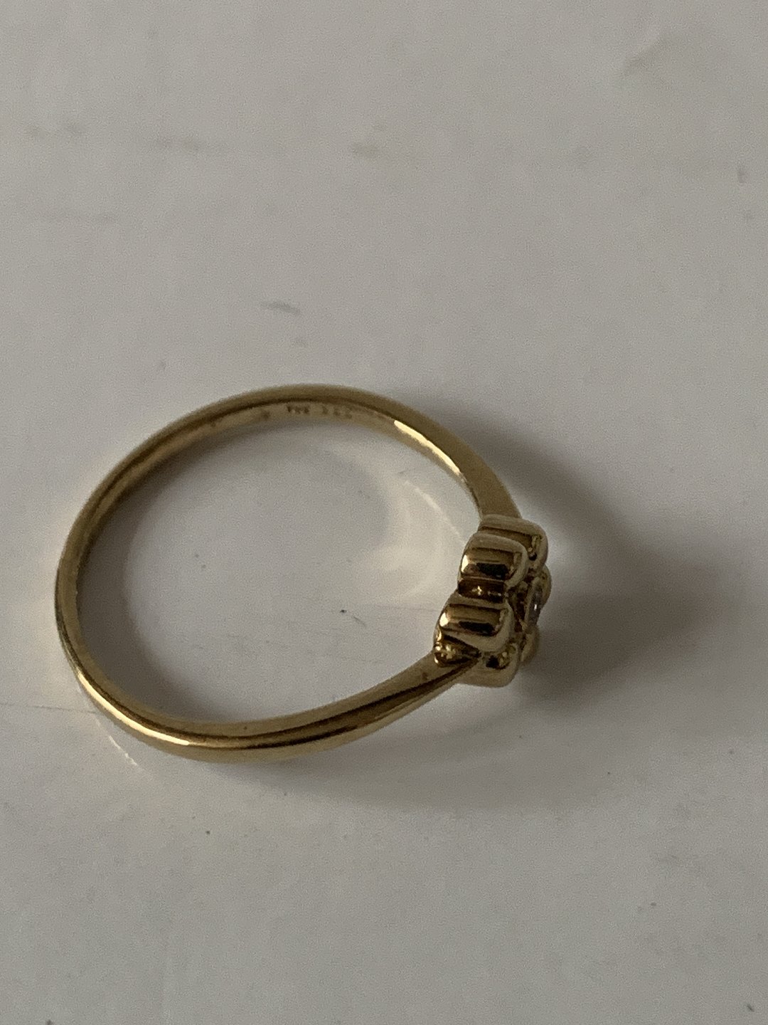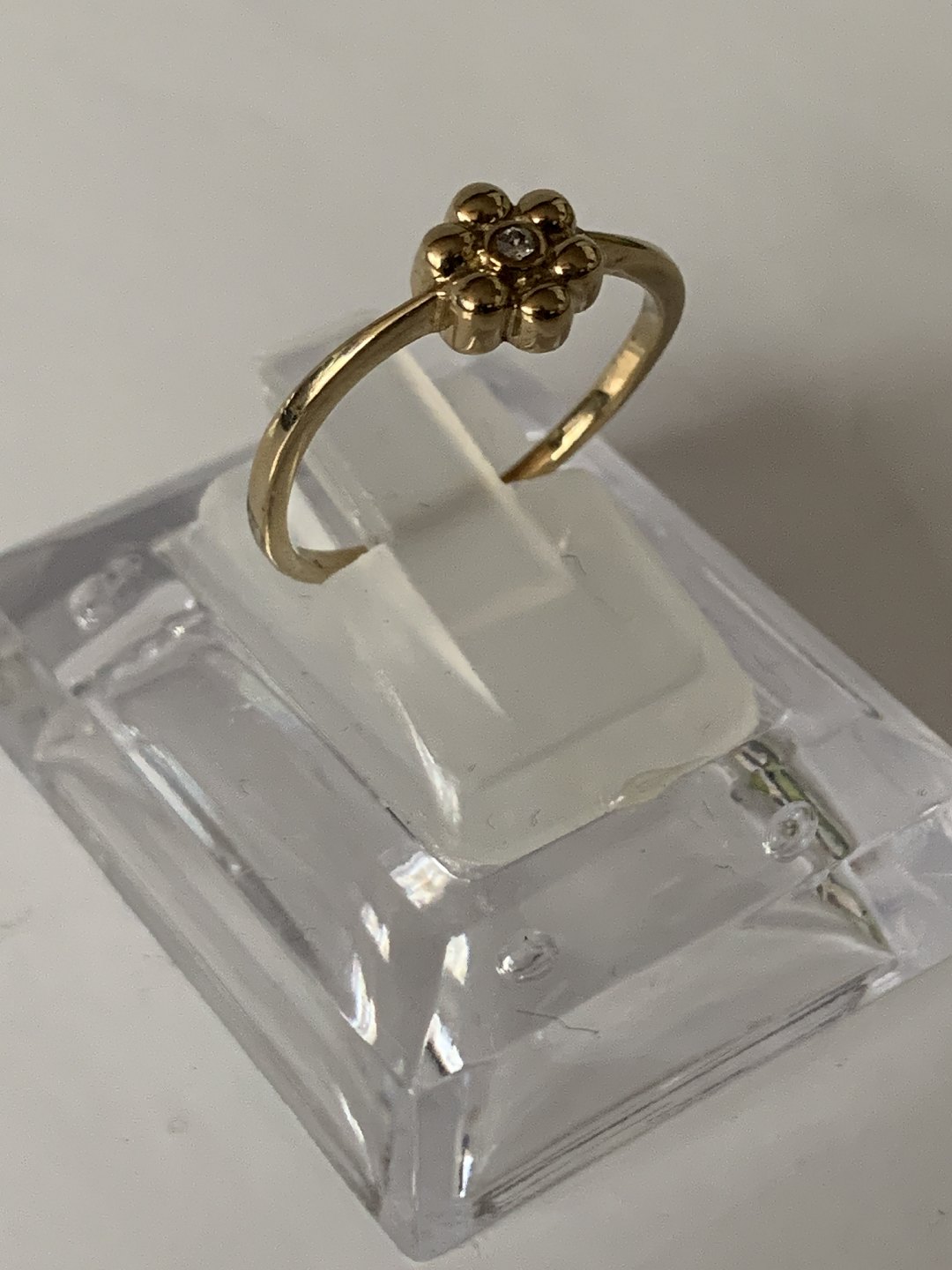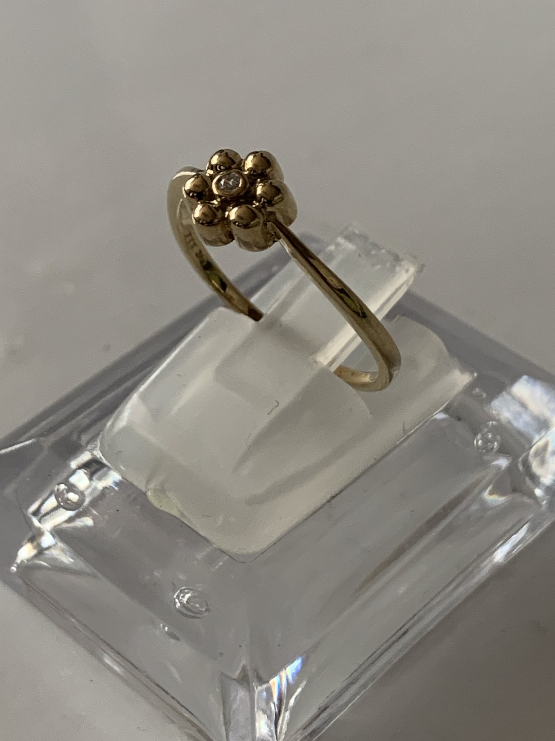 Flot guldring i enkelt design, men blomst på toppen. I midten af blomsten er en lille hvid sten, der giver ringen et smukt feminint udtryk. Ringen kan sagtens bruges som hverdagssmykke, hvor den kan kombineres med andre ringe.
