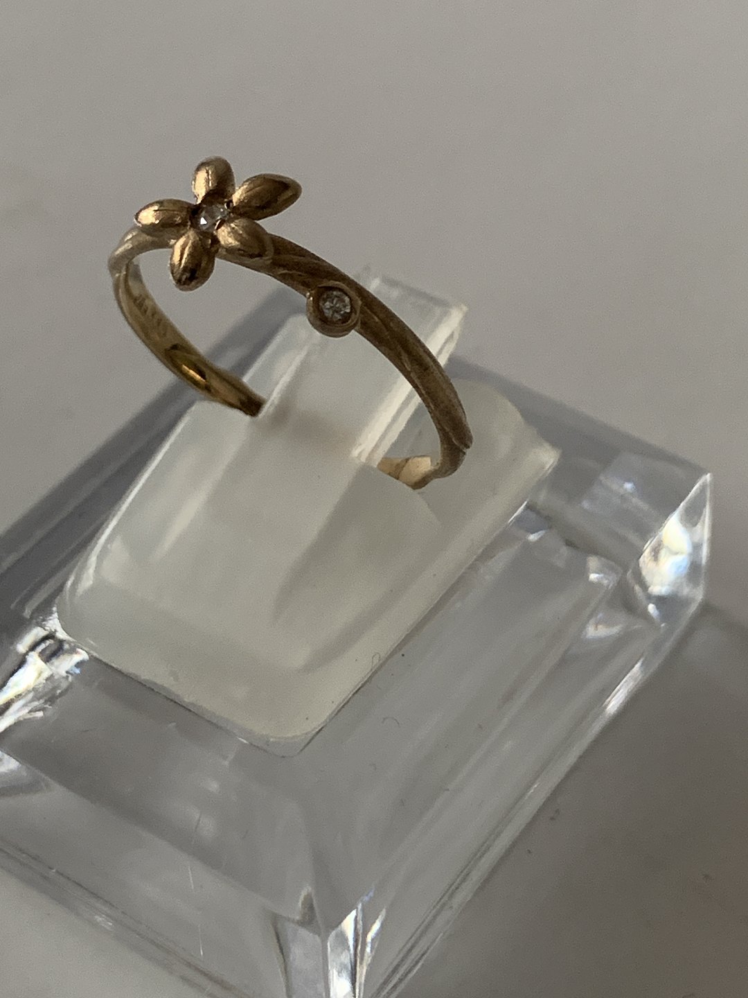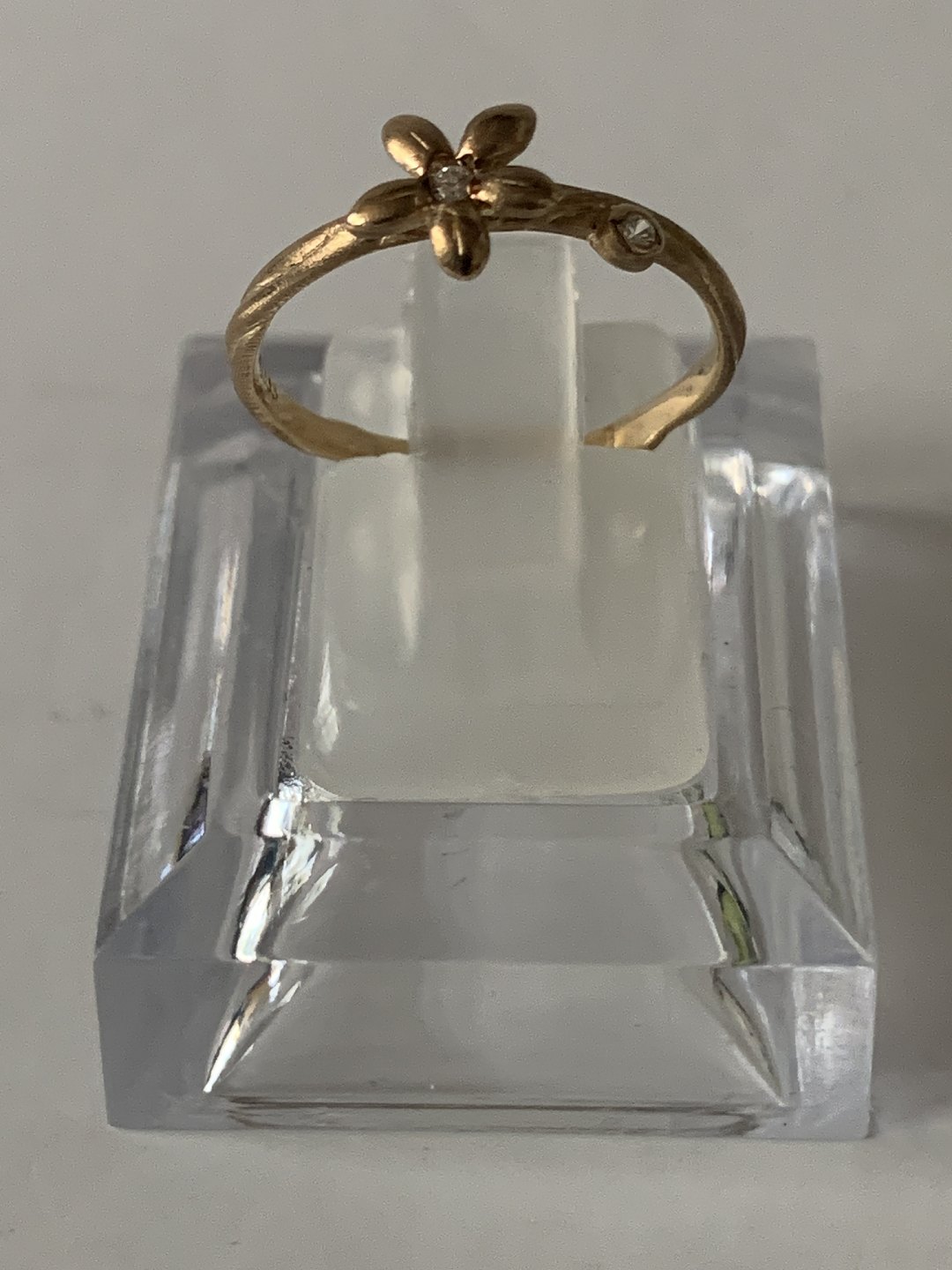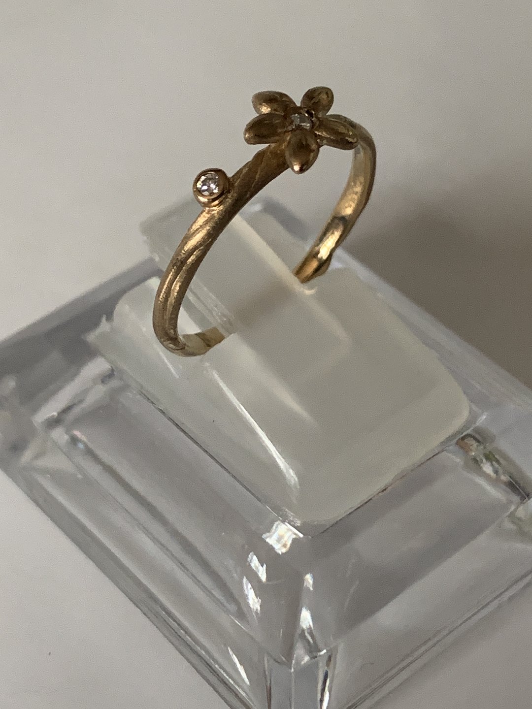 Fin lille guldring 8 karat guld. Blomsten på toppen med den hvide sten, giver et sødt feminint udtryk. Men kombineret med den asymmetrisk placeret hvide sten ved siden af, får ringen sin egen unikke identitet. Dette er en ring der umiddelbart virker simpel, men alligevel har et unikt design, der gør ringen speciel.