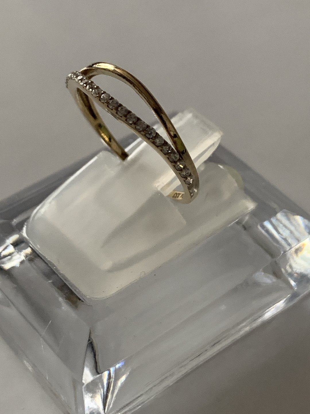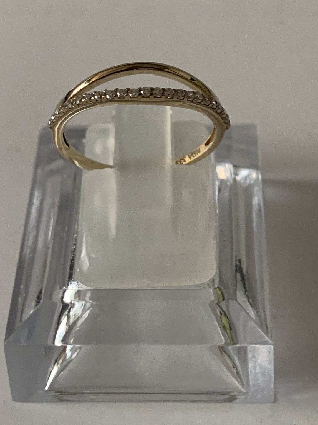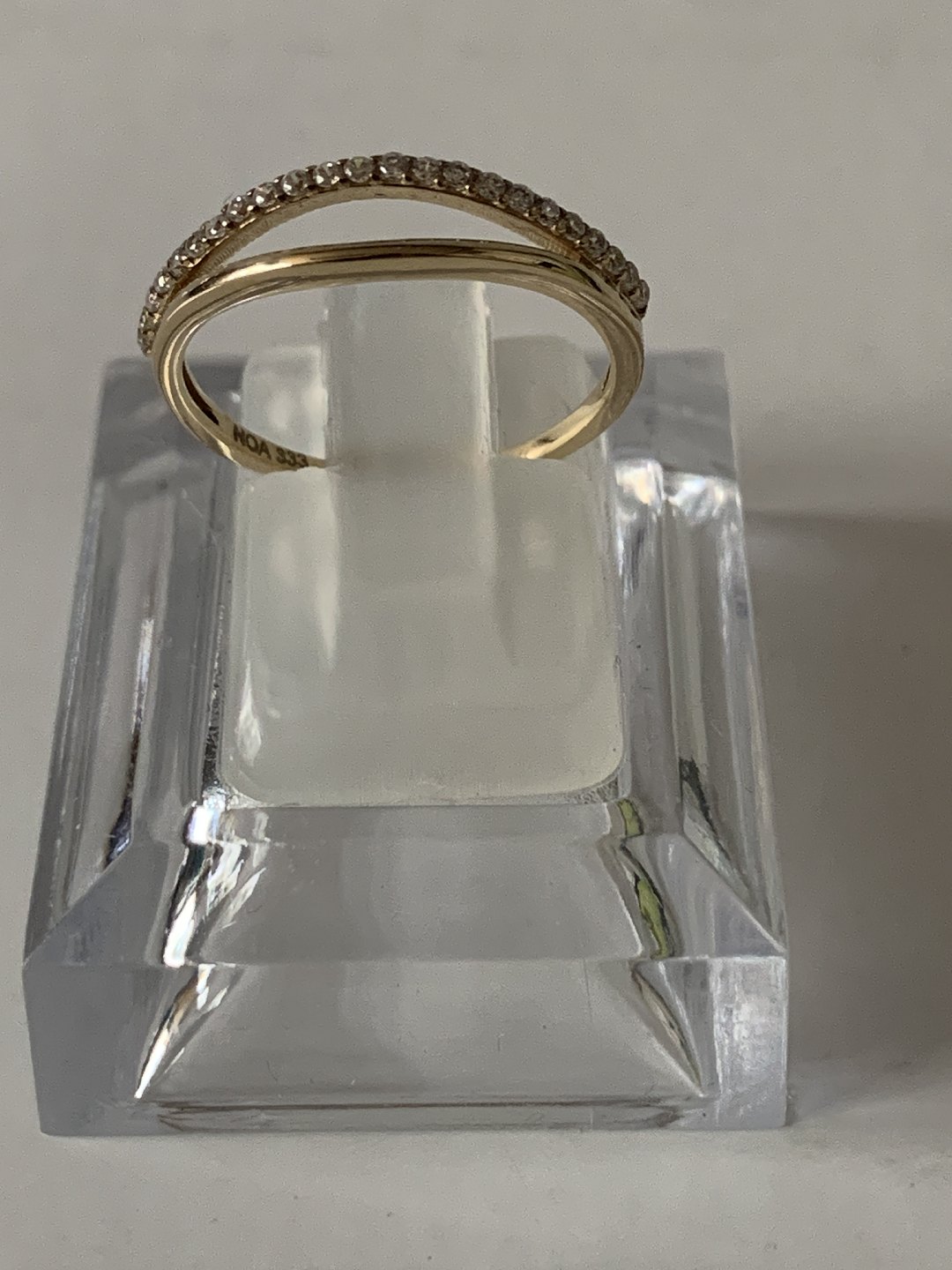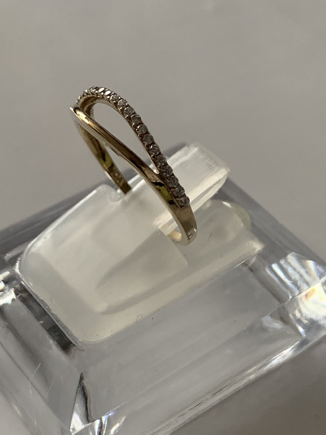 Damering i 8 karat guld, med små hvide sten, og kløvet top.