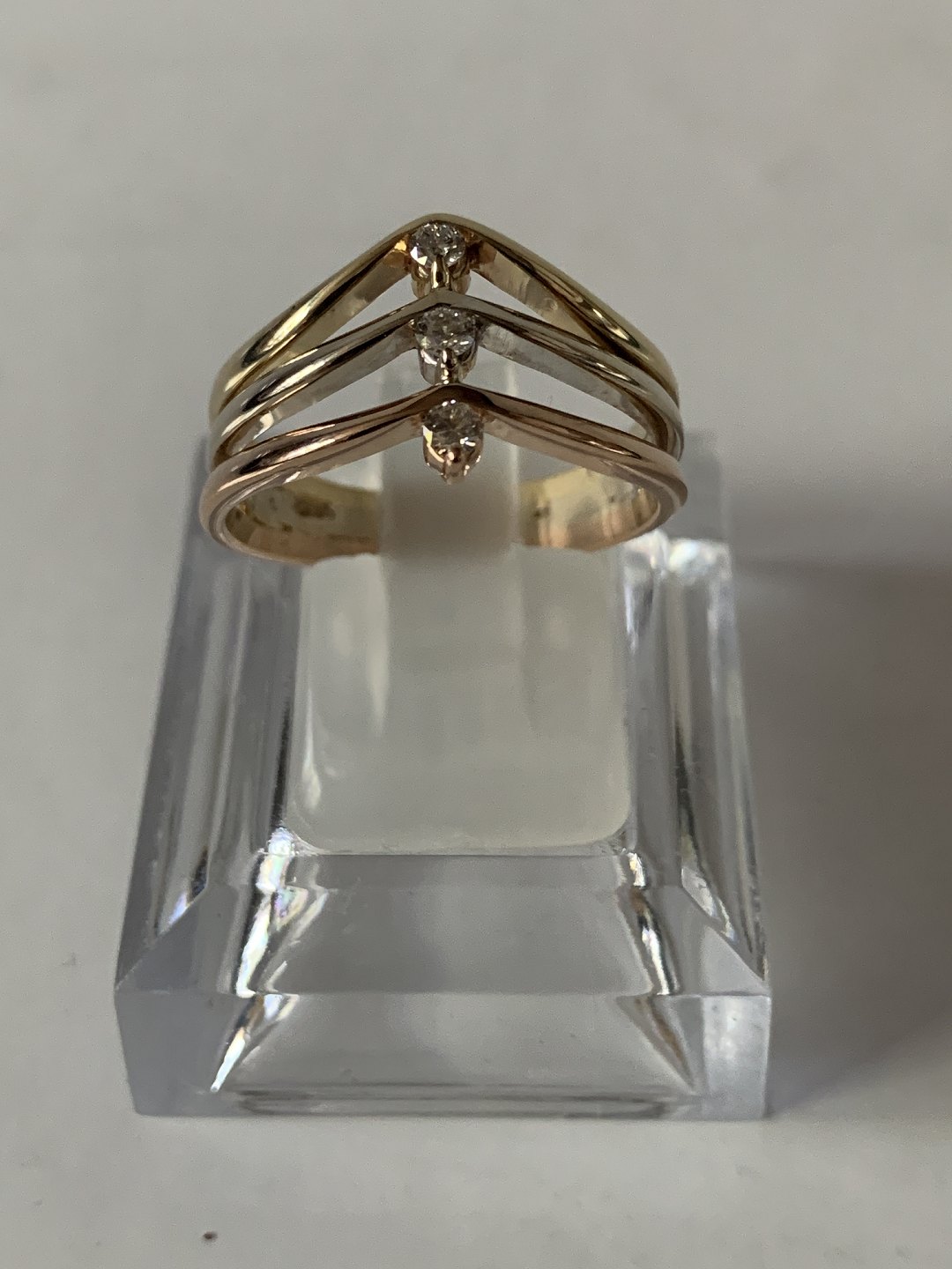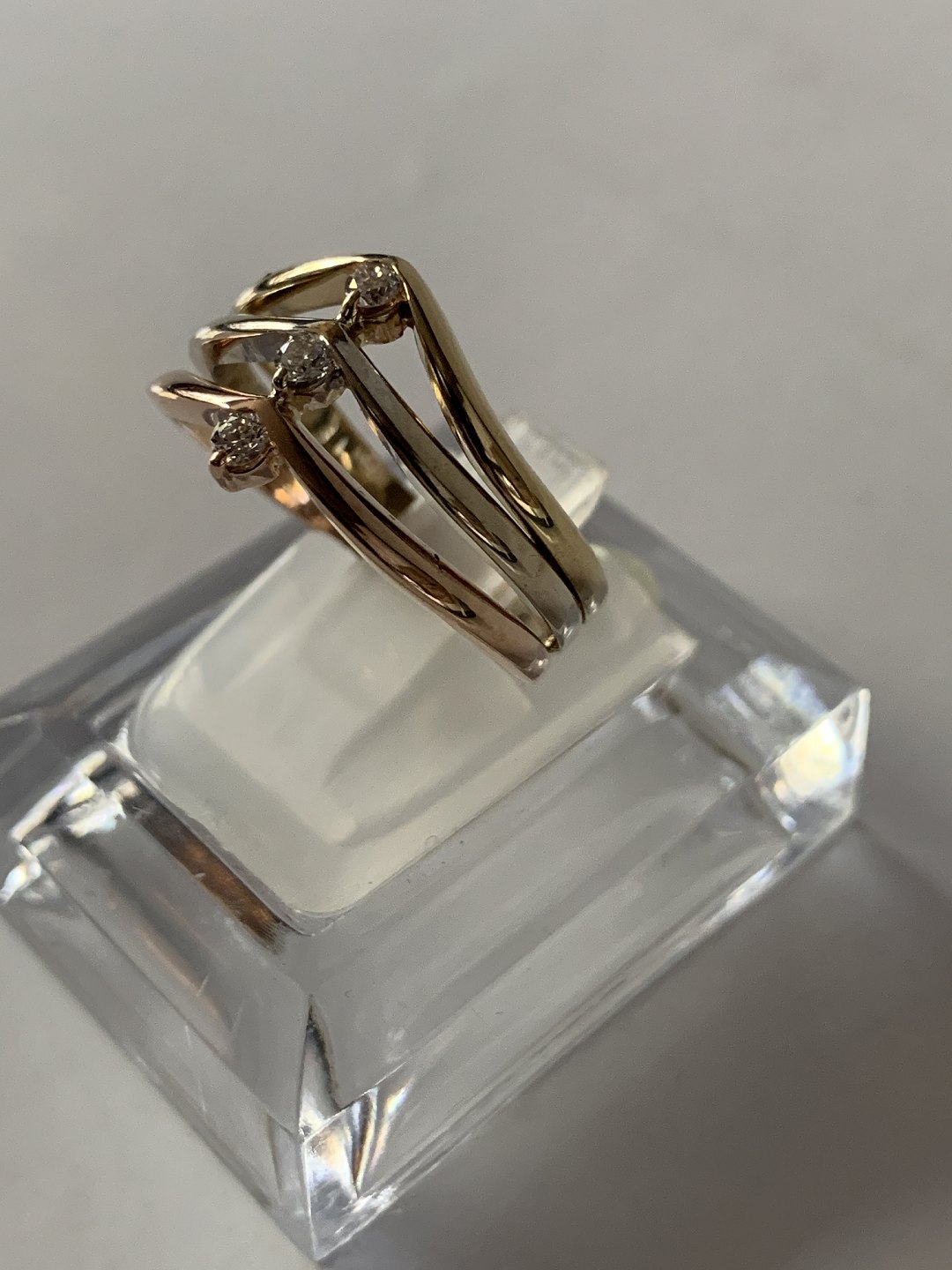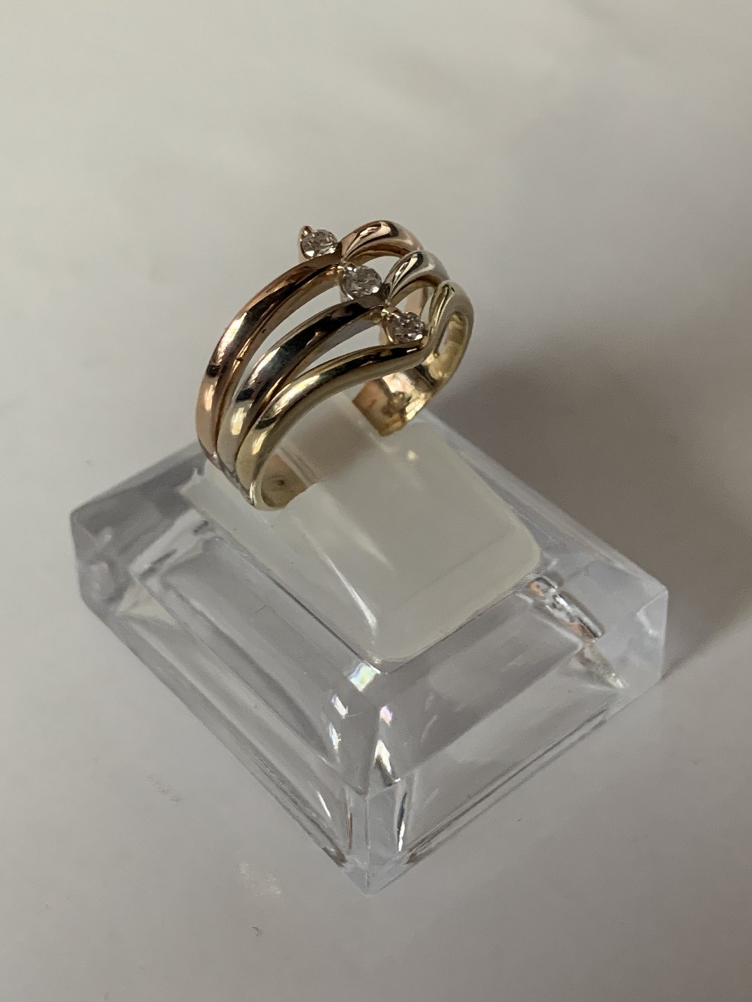 Damering i 14 karat, 3-farvet hvid- og rødguld med brillanter. Stemplet 585. Str. 58