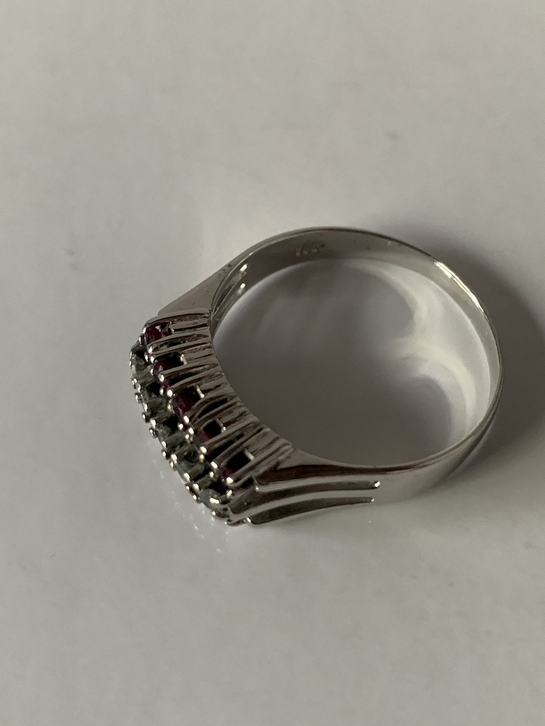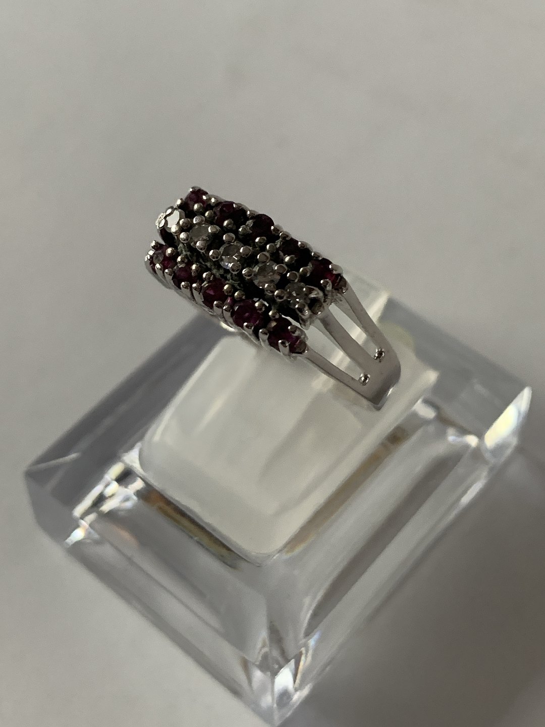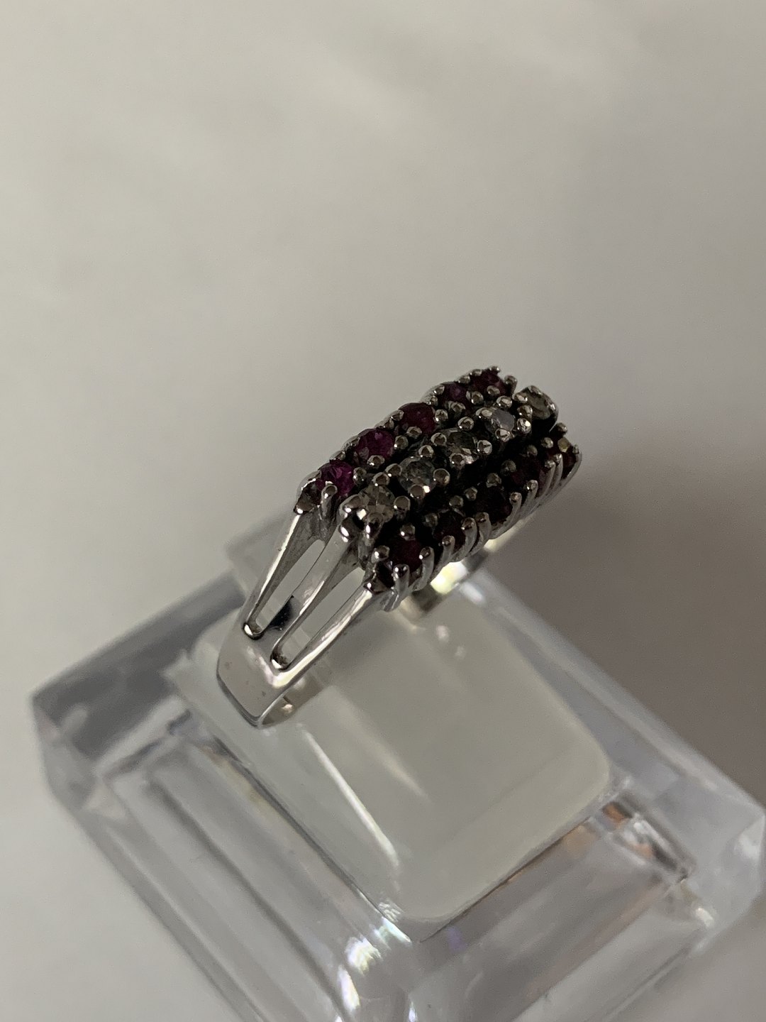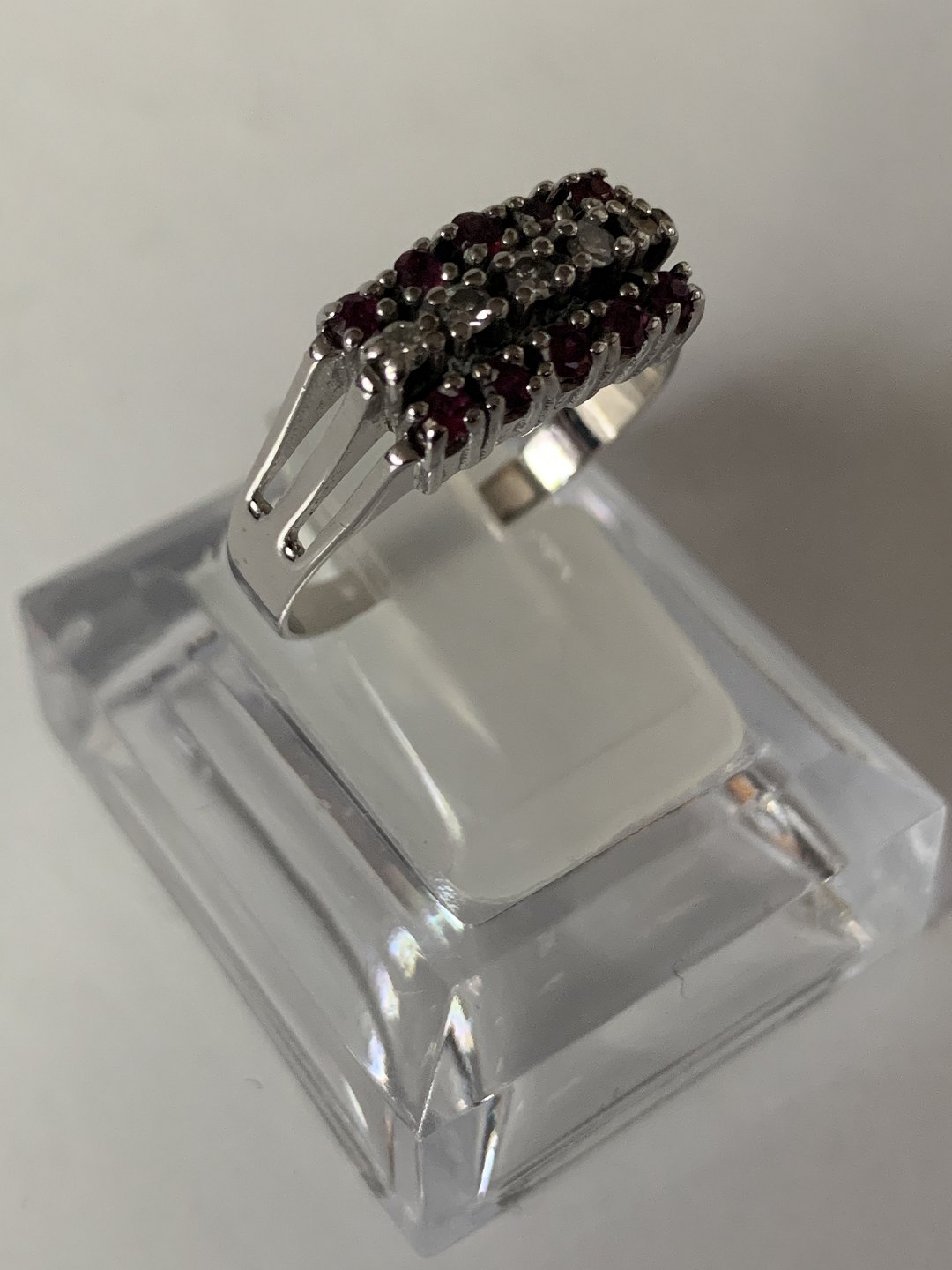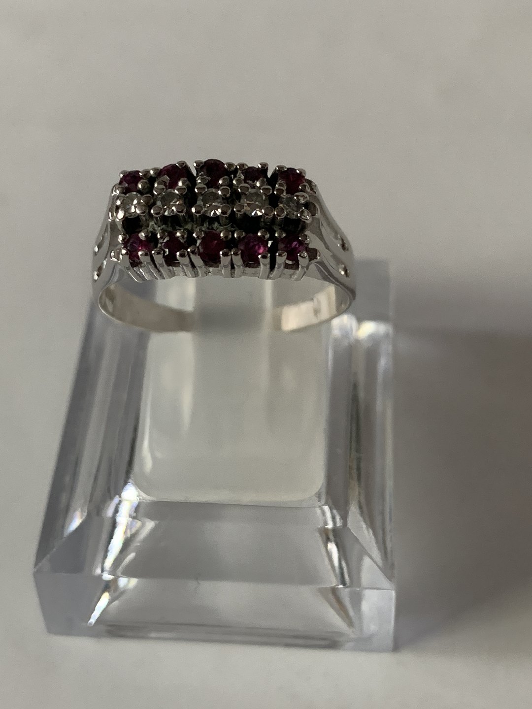 Damering i 14 karat hvidguld, med brillanter og røde rubiner. Str. 61