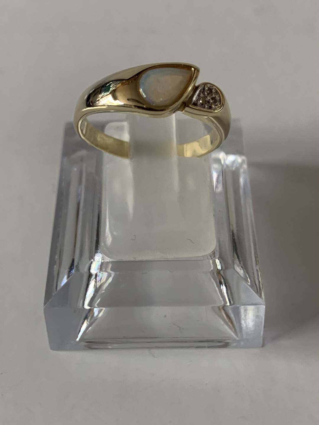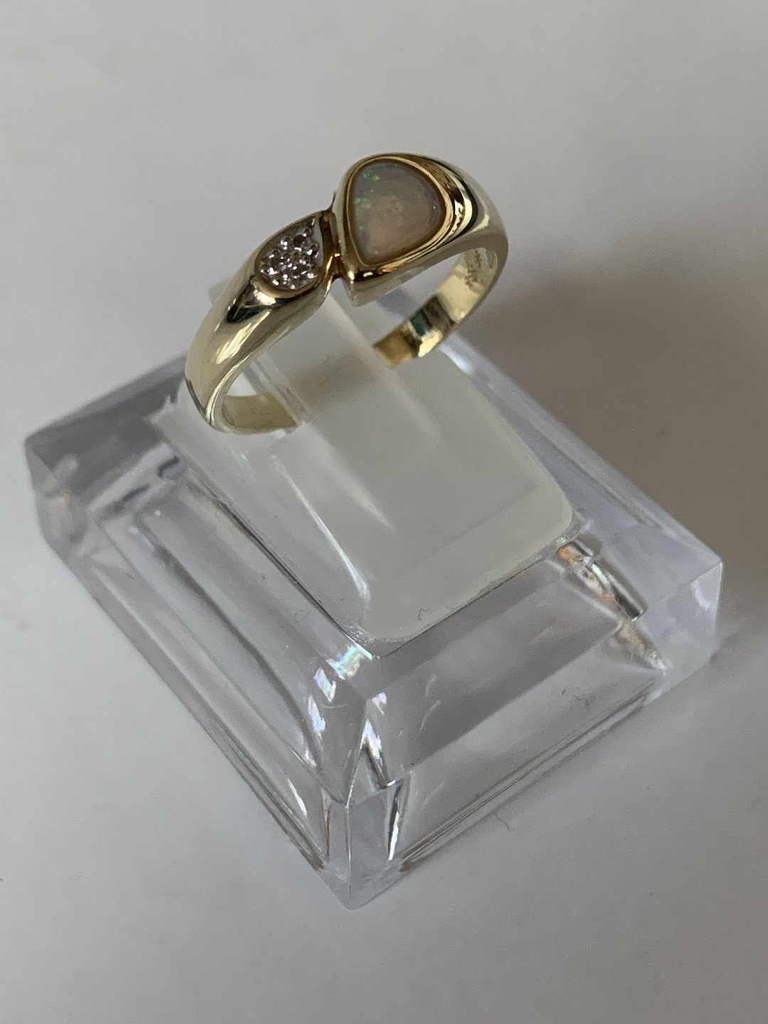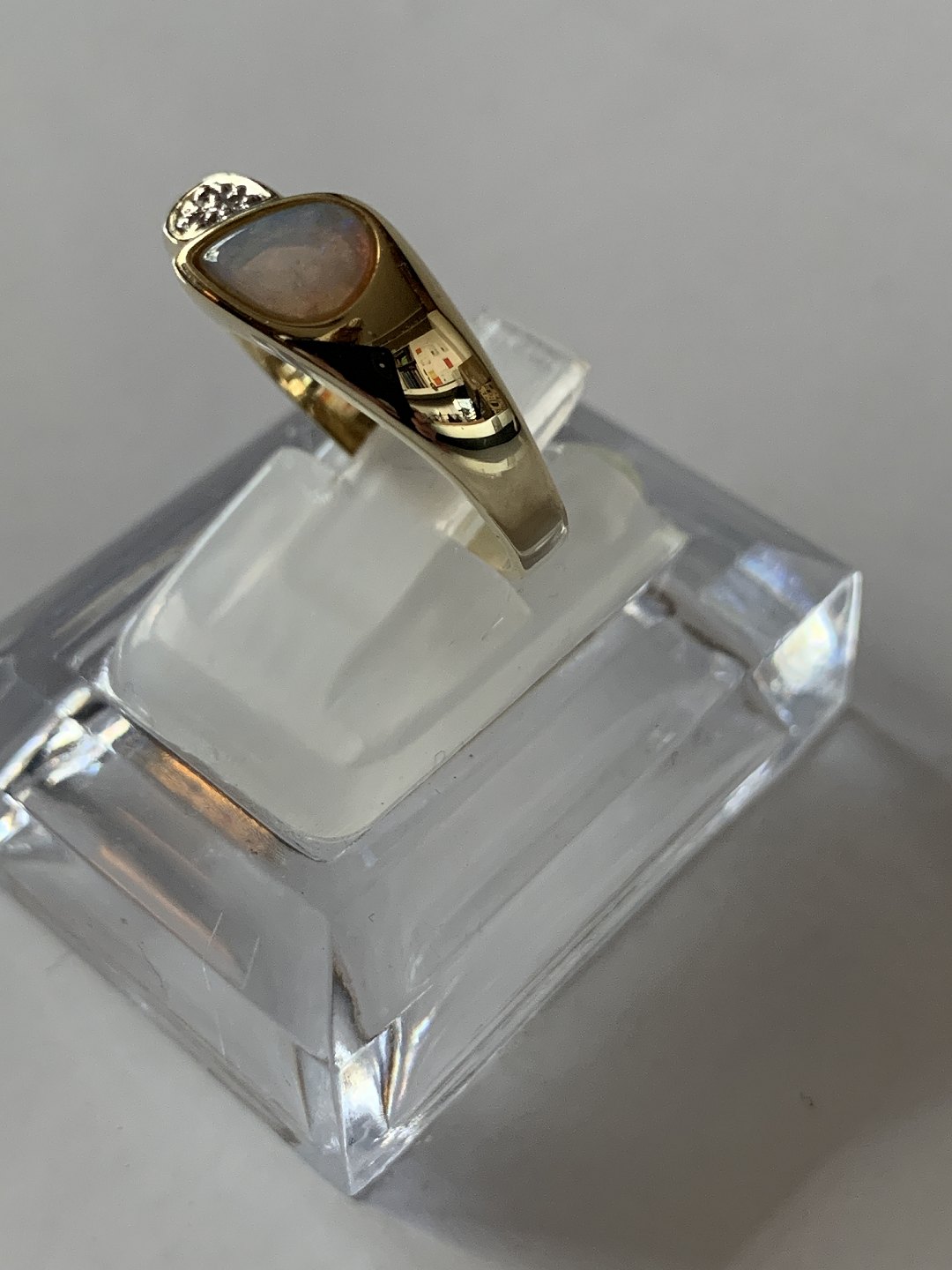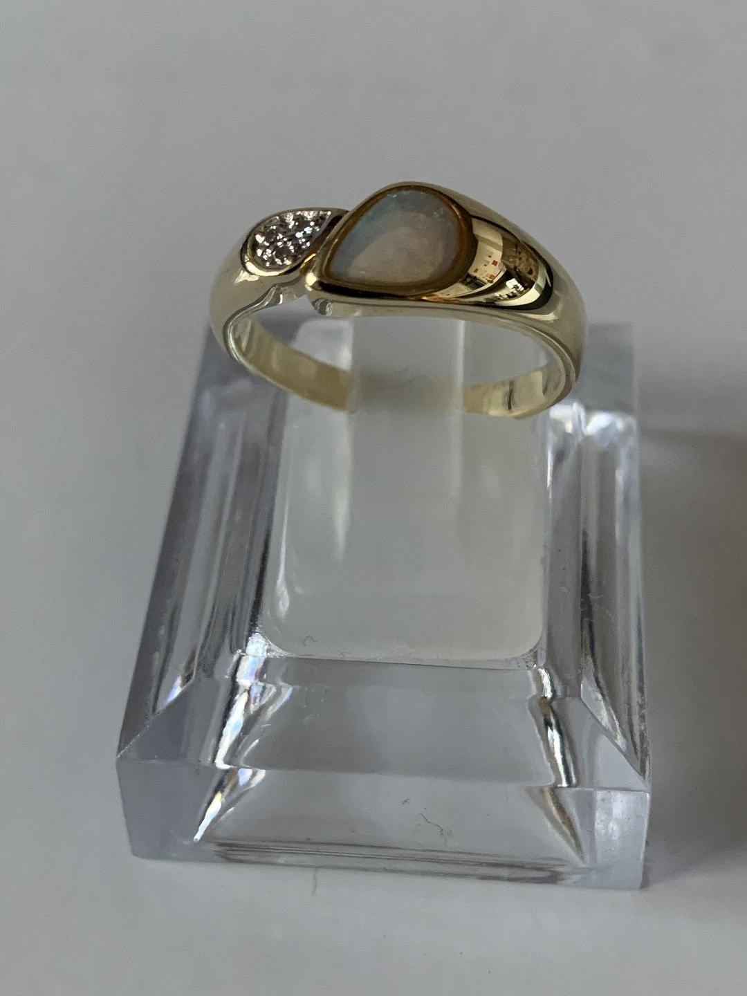 Damering i 14 karat guld, med opal-lignende sten og brillanter. Stemplet SC 585. Str. 56.