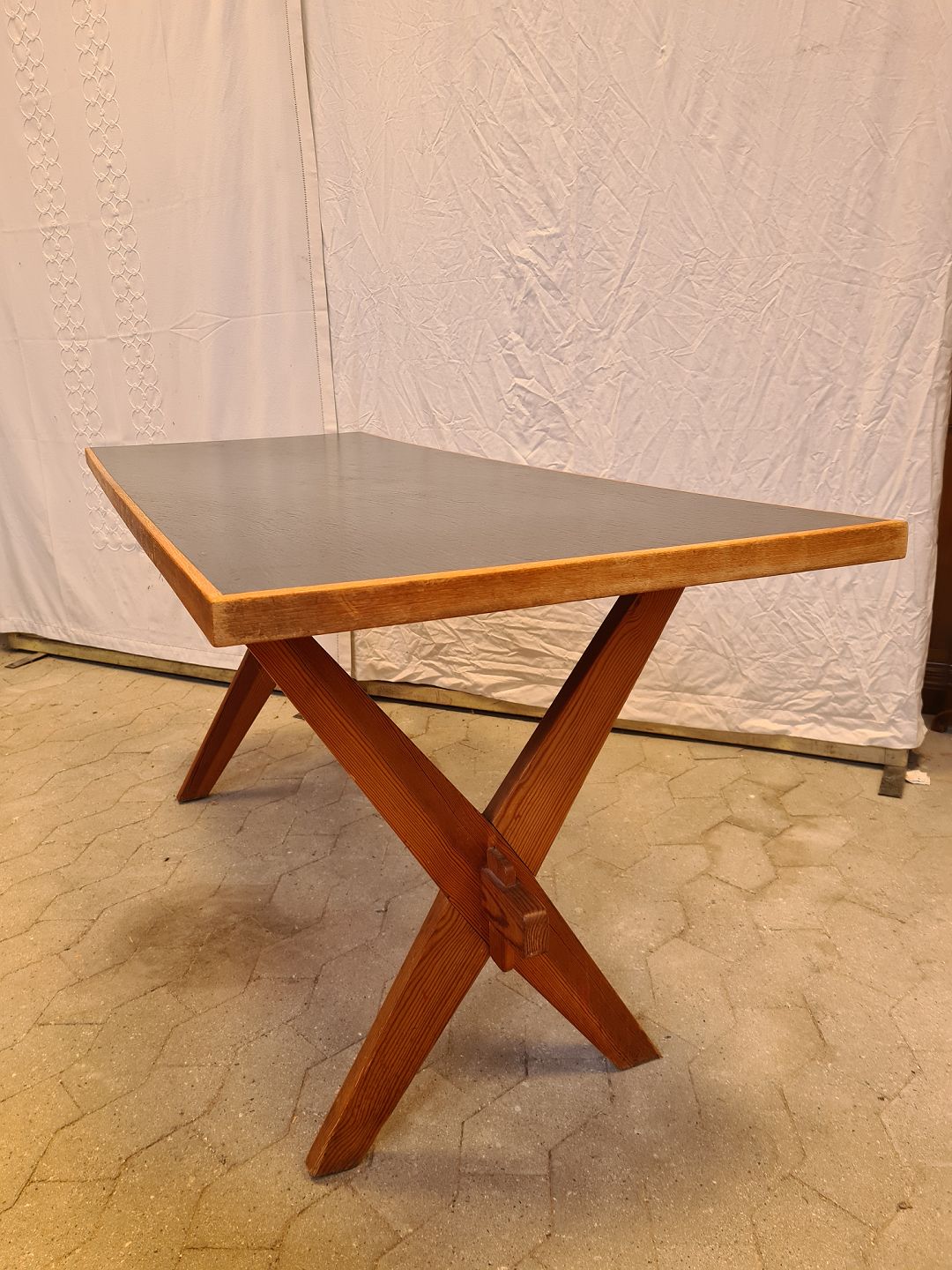Bord med understel i massivt fyrretræ, plade med lister af egetræ og linoleum.