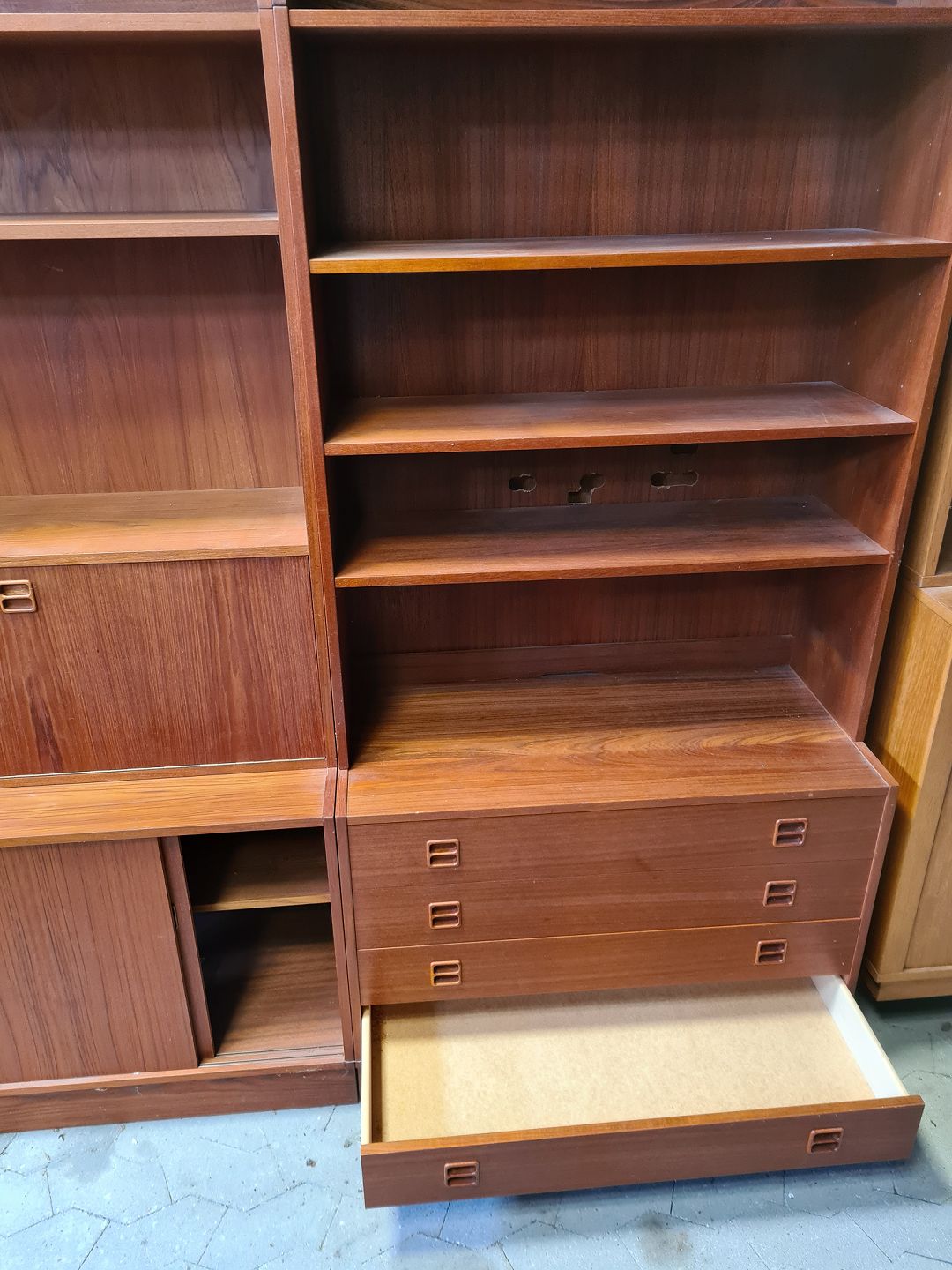 2 Reolsektioner i fineret teaktræ, fra 1960erne.