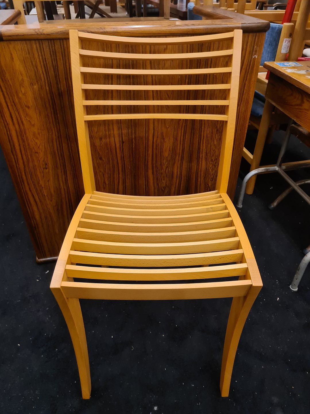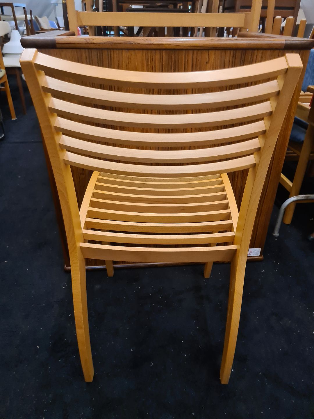 Nyere skulpturel stol i bøg af ukendt designer. Fremstår pæn og velholdt uden nævneværdige brugsspor.