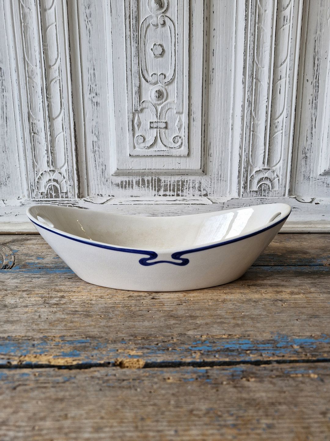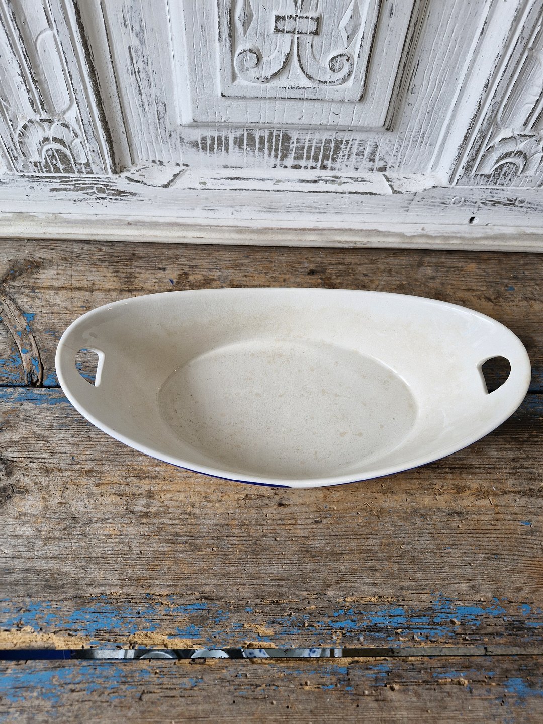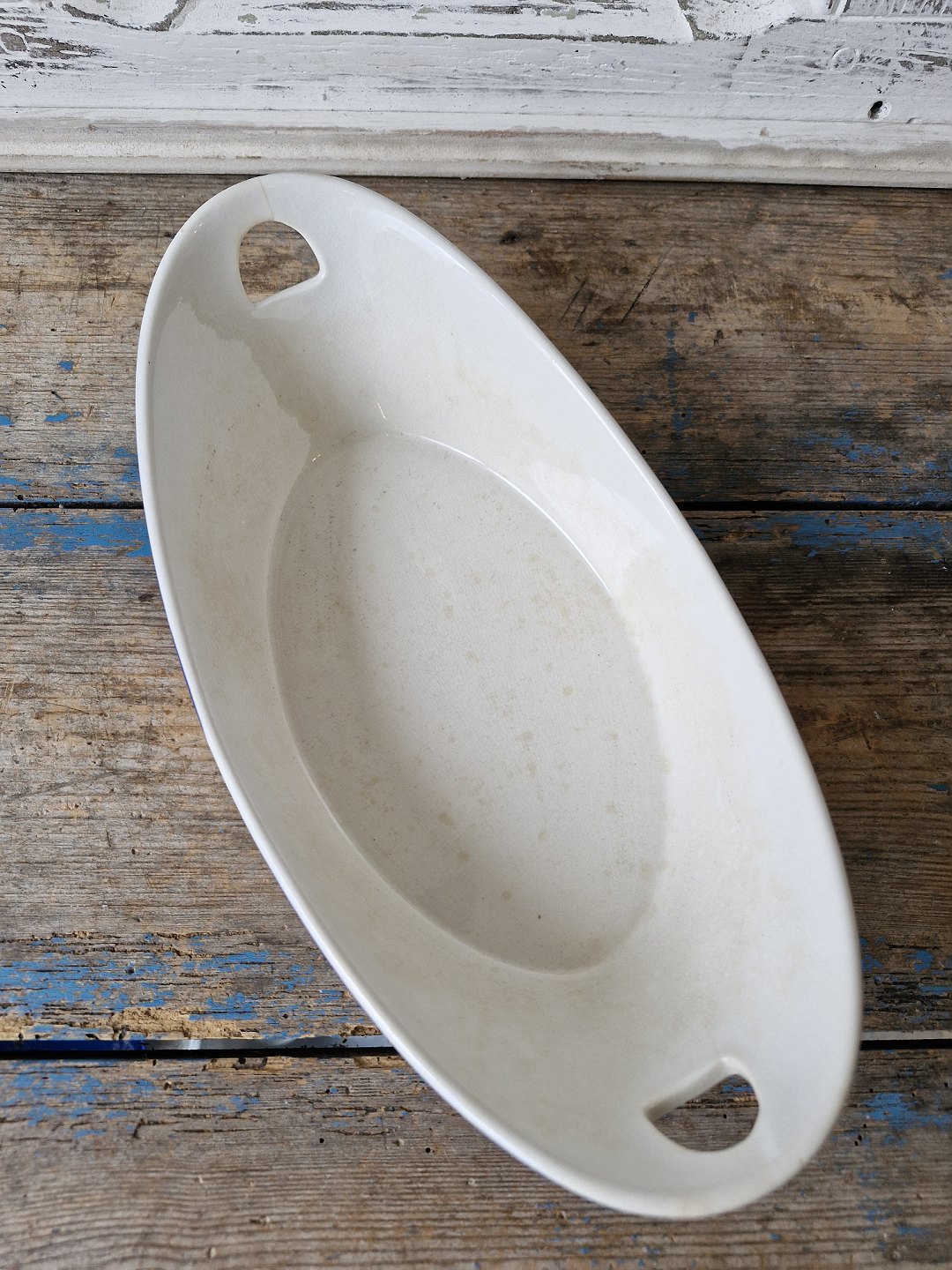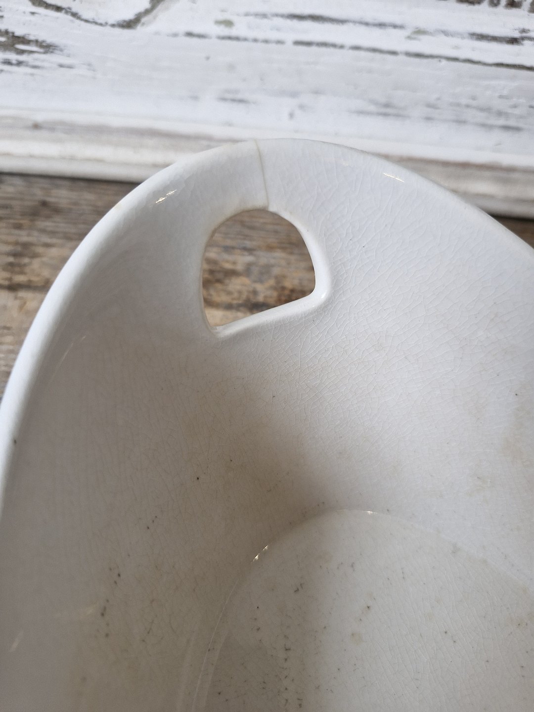 With hair crack at one handle and some discoloration inside the bowl.