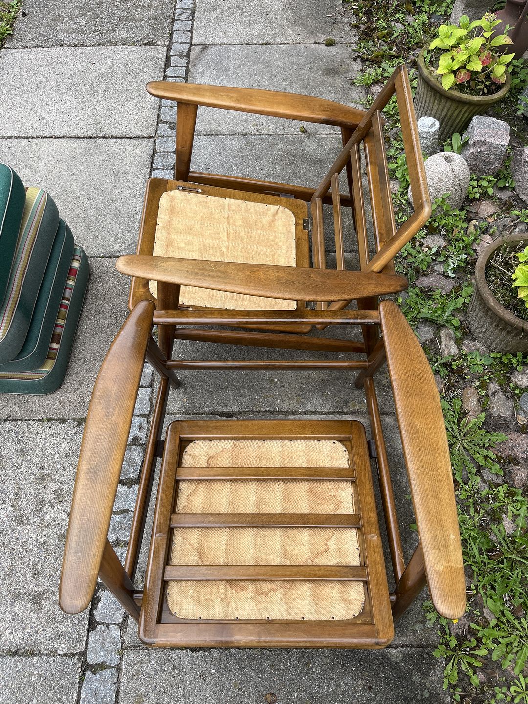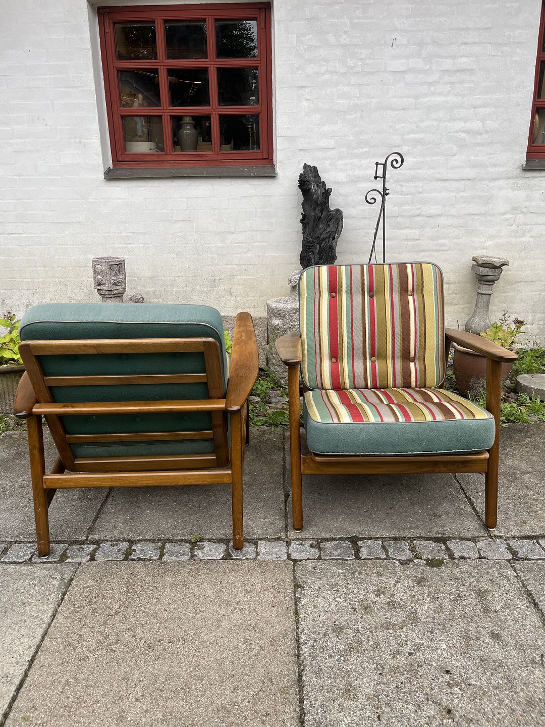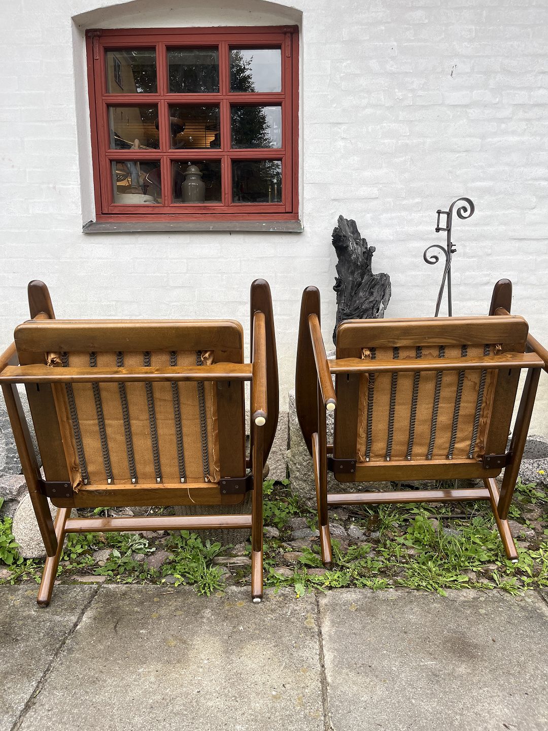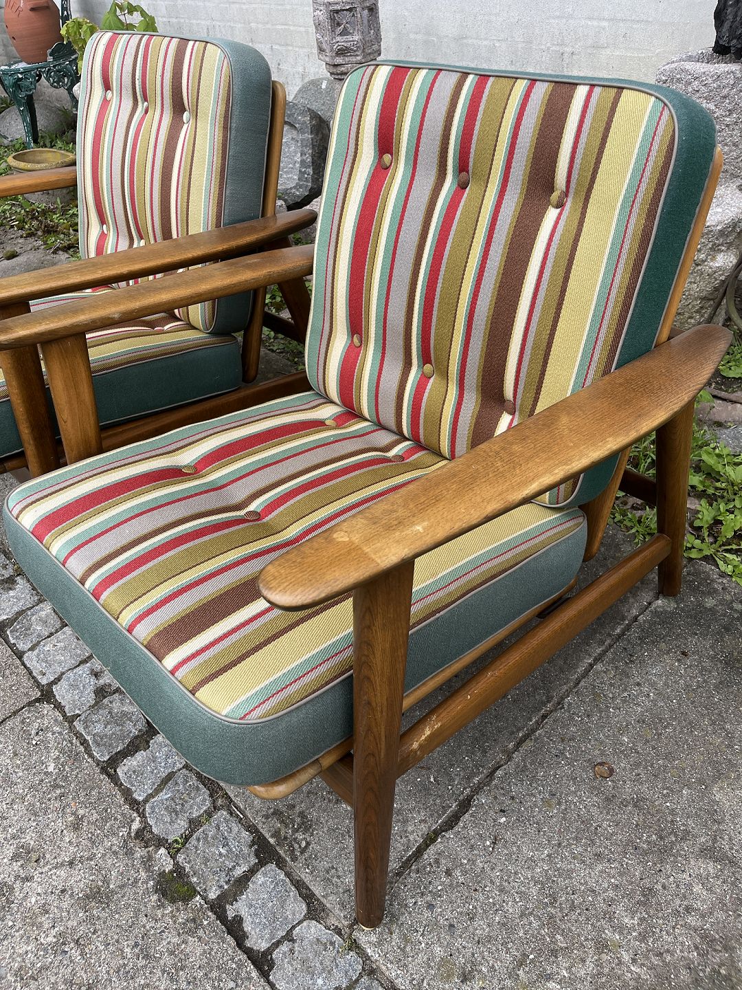 Hans J. Wegner ænestol i bejset bøgetræ og fjedrehynder betrukket med Uldstof produceret af Getama i 1950’erne.