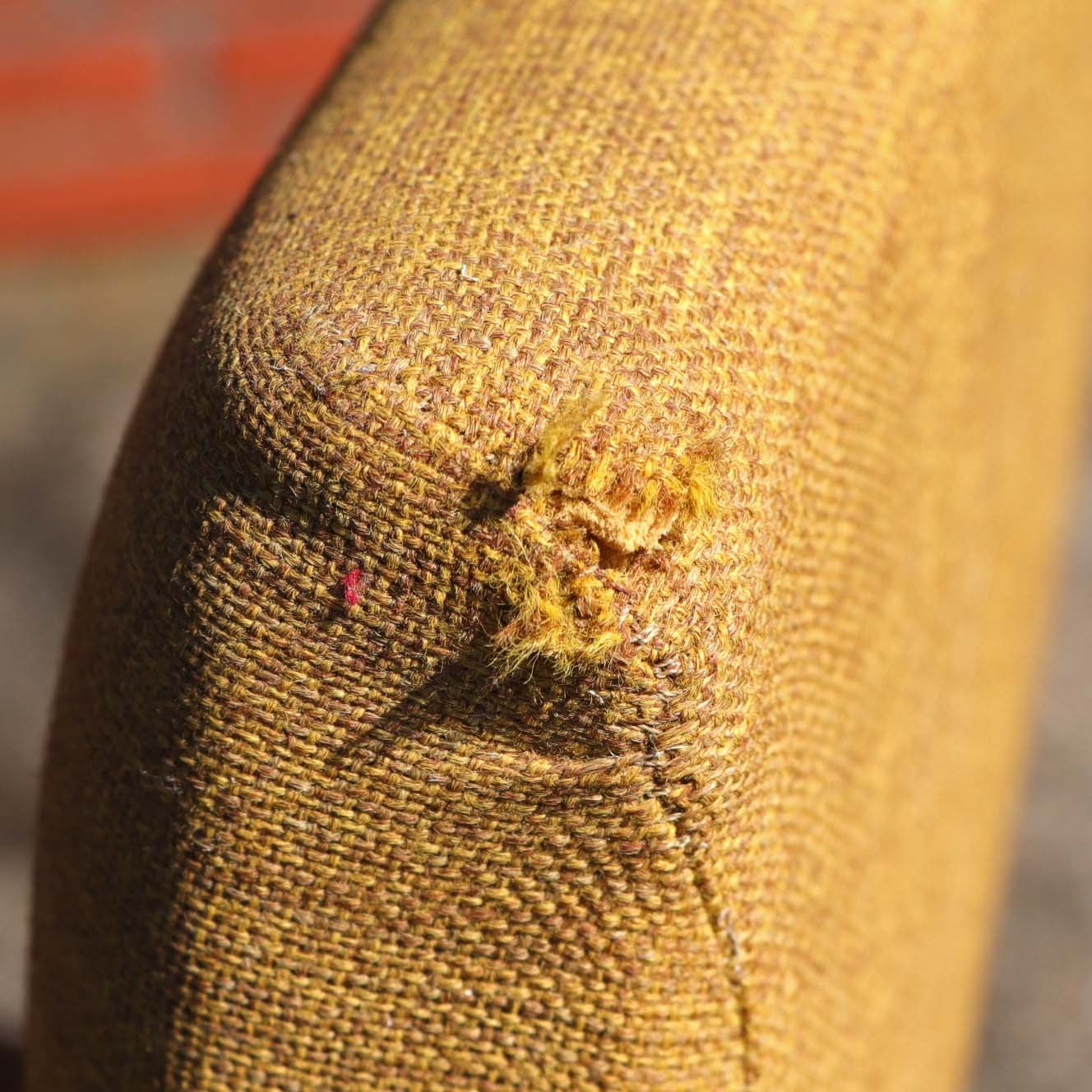 Fremstår med brugsspor i form af vandmærker og ridser på stel samt mindre hul i betrækket.