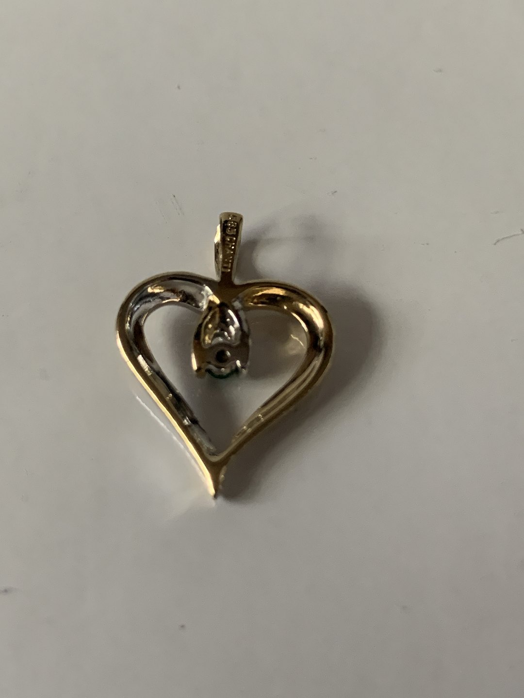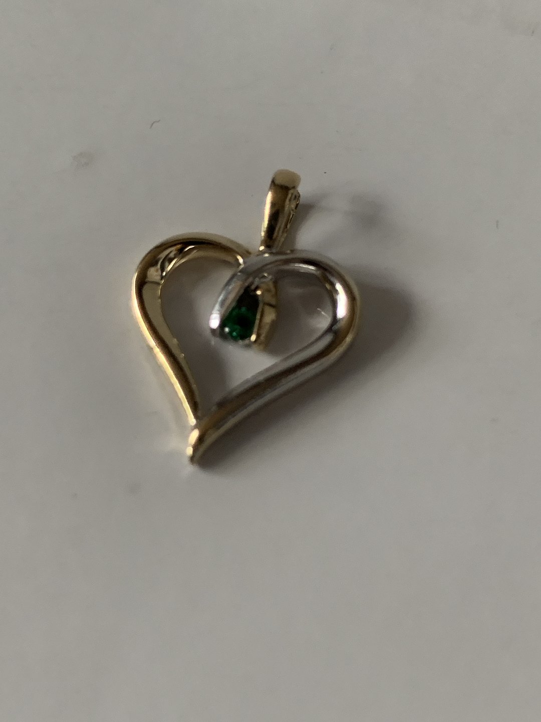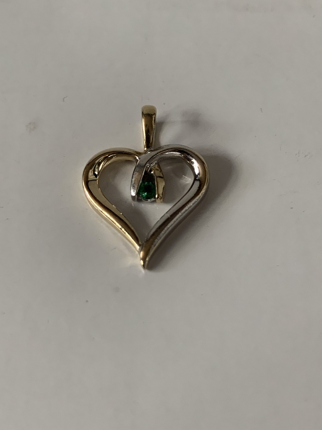 Smukt hjerteformet vedhæng i 14 karat Rød-Hvidguld, med indlagt smaragd. Dette vedhæng vil passe perfekt i en tynd kæde om halsen, og det vil være diskret men samtidig elegant. Vedhænget er udformet elegant og minimalistisk, og giver vedhænget et flot look. Kan med fordel kombineres med et guldarmbånd.