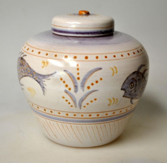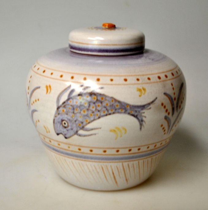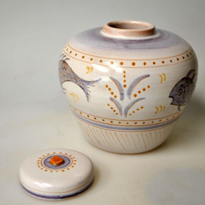 L. Hjorth lågkrukke, 20. årh. Bornholm, Danmark. Rødler med håndmalede dekorationer af fisk. Signeret no. 9. Højde.: 12 cm.
