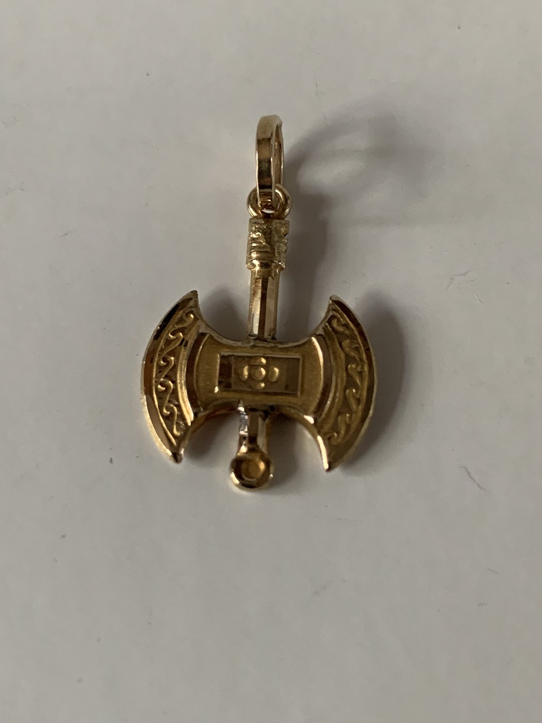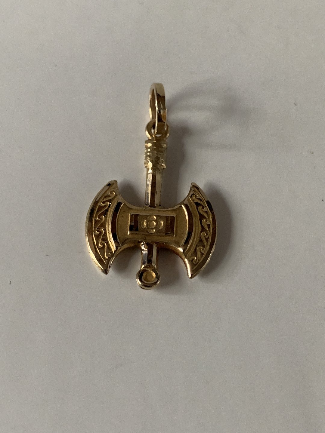 Vedhæng i 14 karat guld, udformet som dobbelt økse- strids økse, og med flotte detaljer og mønstre. Vedhænget udstråler stor energi og styrke. Vedhænget er lavet med mange fine detaljer, der vil komme fuldt til udtryk hvis man kombinerer vedhænget med en massiv guldkæde.
