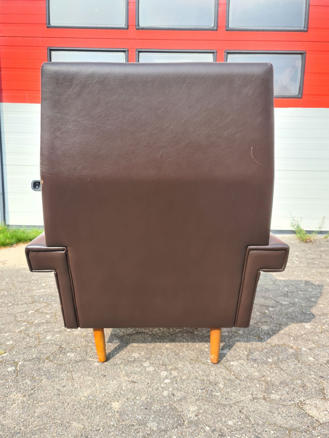 Lænestol i læder med ben i teaktræ, fra 1960erne.