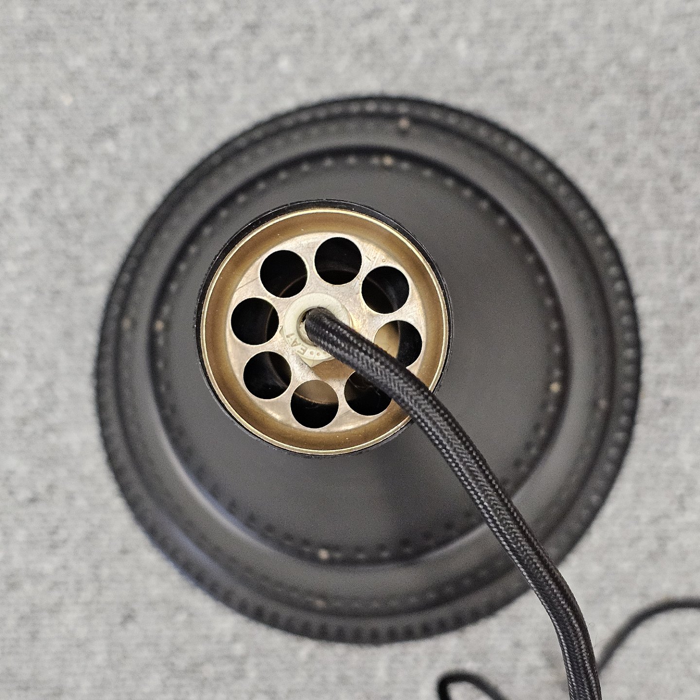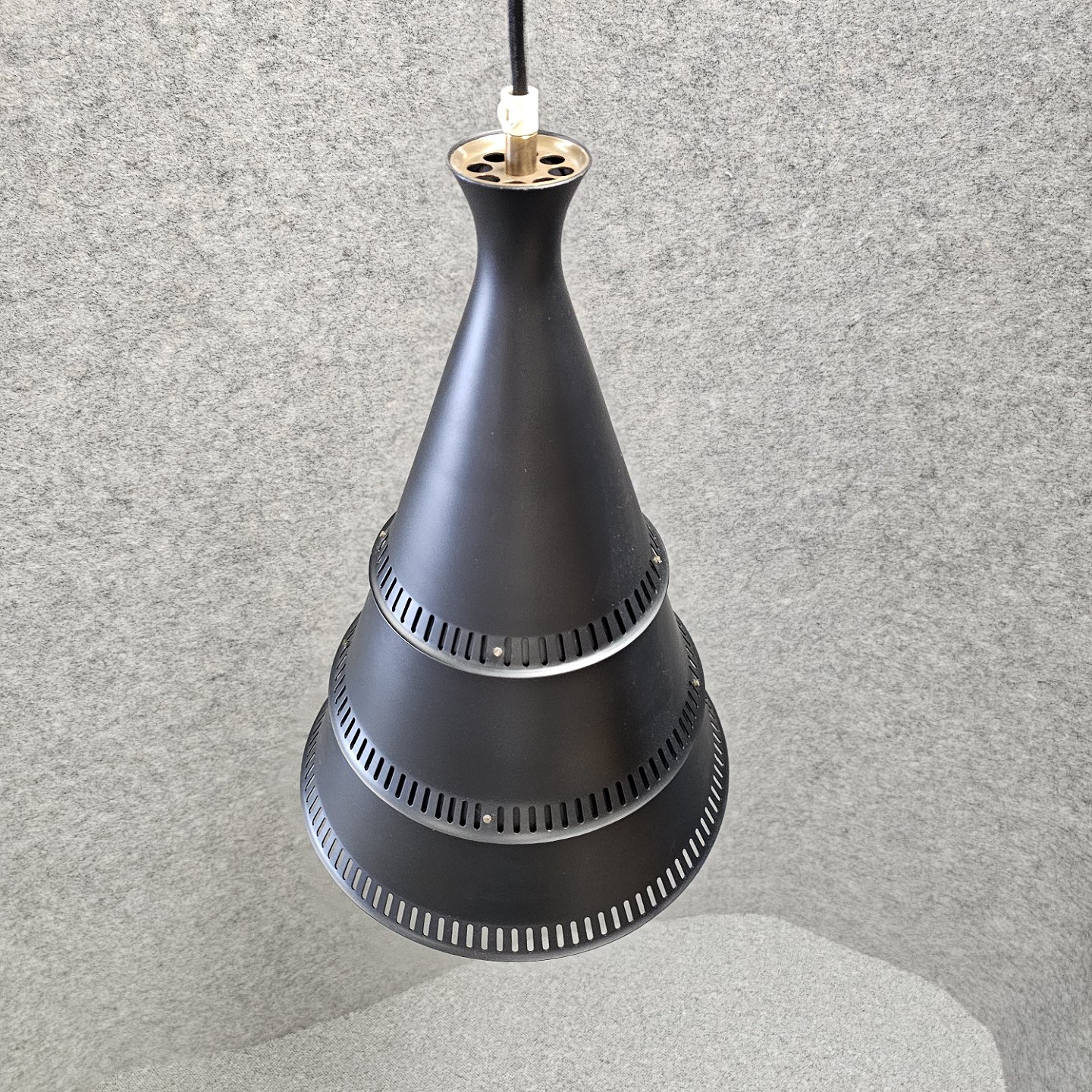 Kegleformet pendel af sortmalet metal med lys inderside. Lampen består af 3 lag. Model 208
