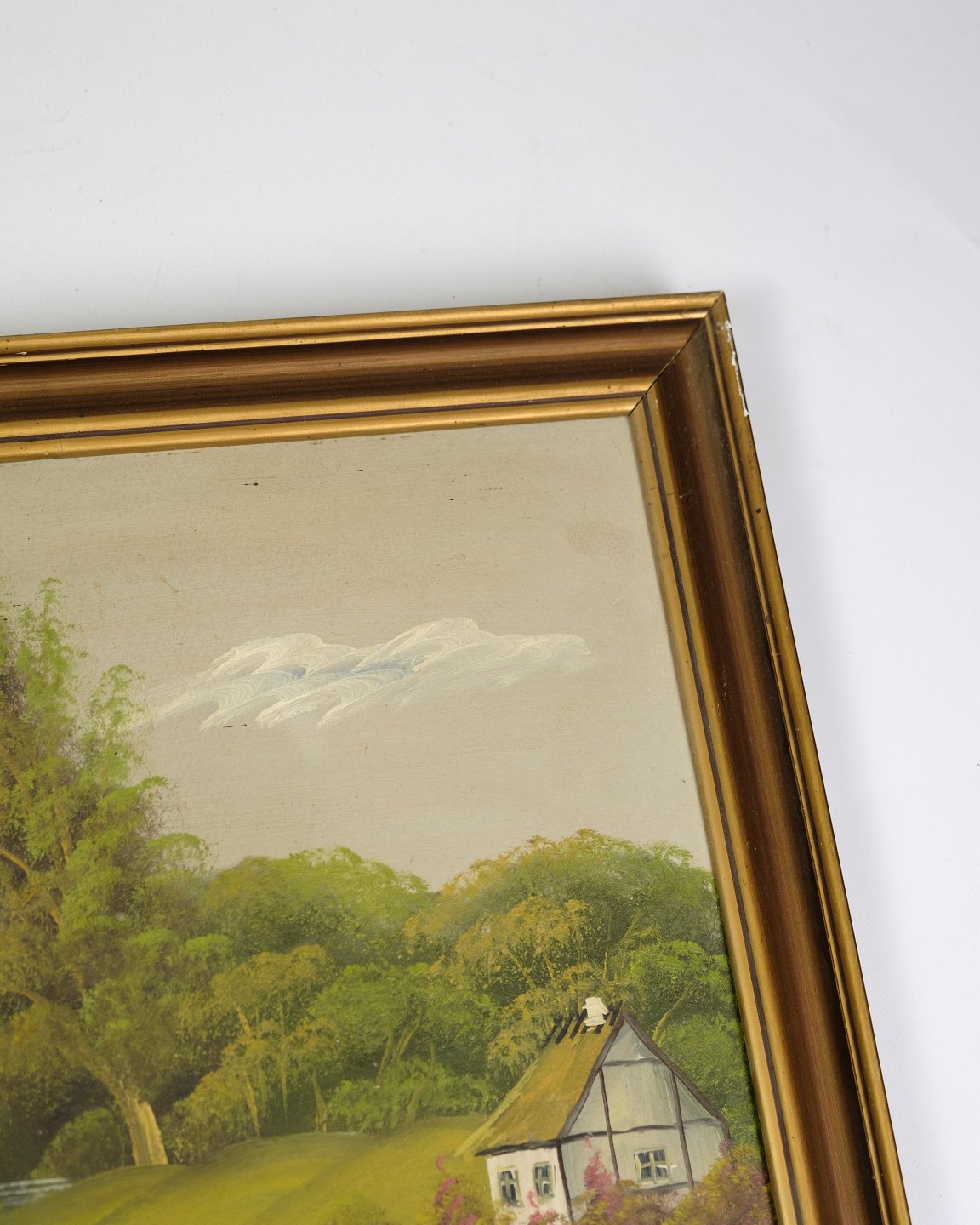 Oliemaleri med motiv af et bondehus beliggende i en skov, med skoven og vandet som baggrund til i billedet. En lille vej fører ned til huset og skaber en stemningsfuld forbindelse mellem naturen og hjemmet. Maleriet indfanger en fredfyldt atmosfære med naturens rolige elementer.