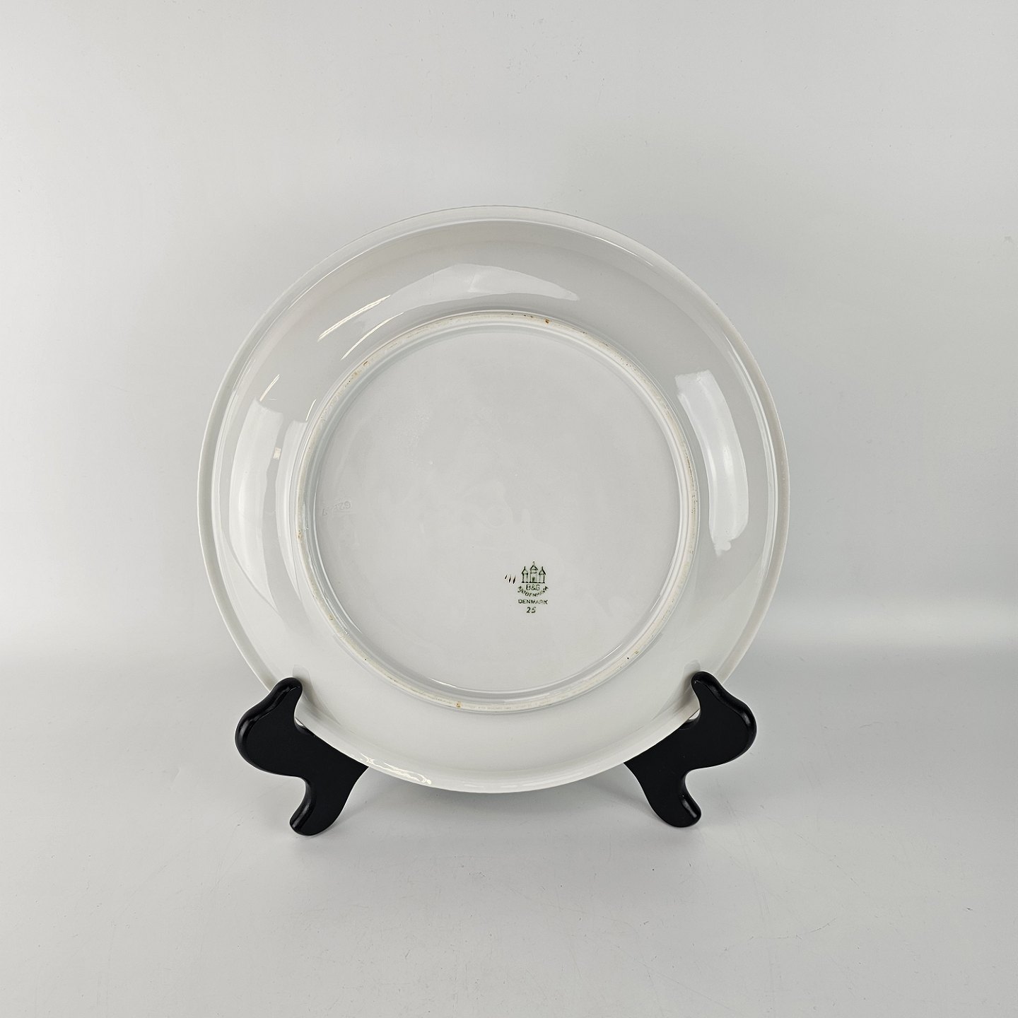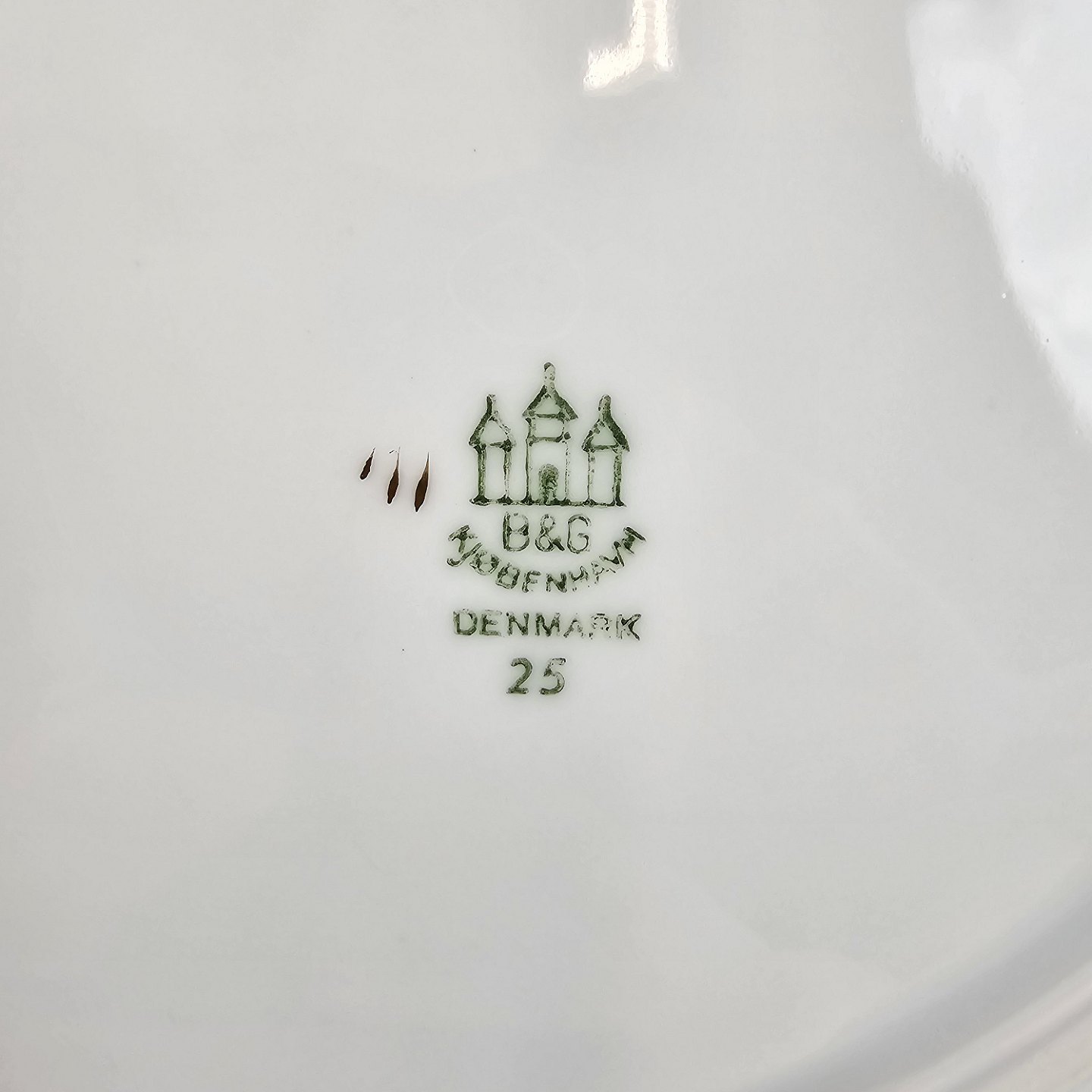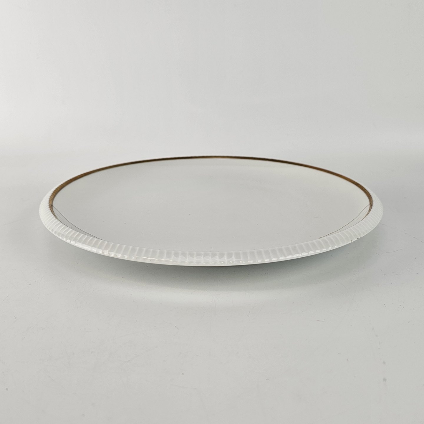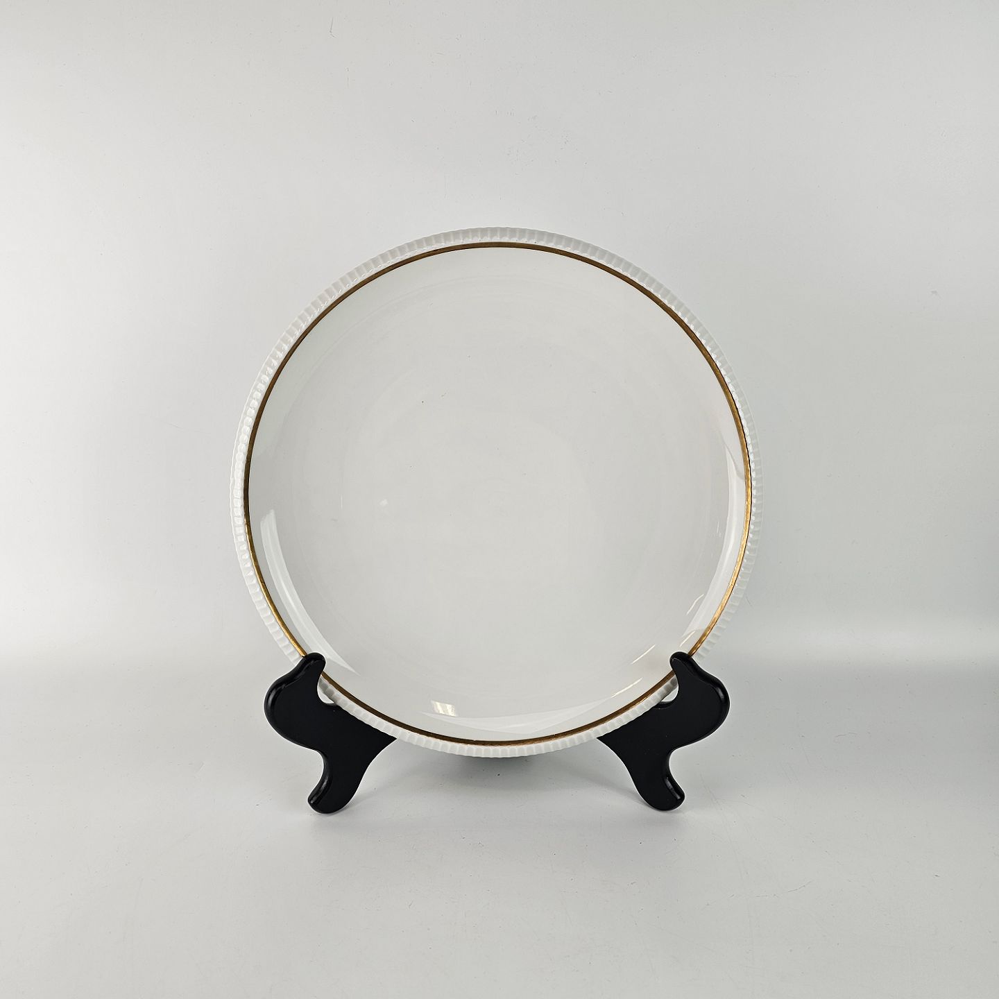 Vega er hvidt porcelæn med guldkant. Tallerkener og fade er dekoreret med riller i kanten. Kan fremstår med brugsspor