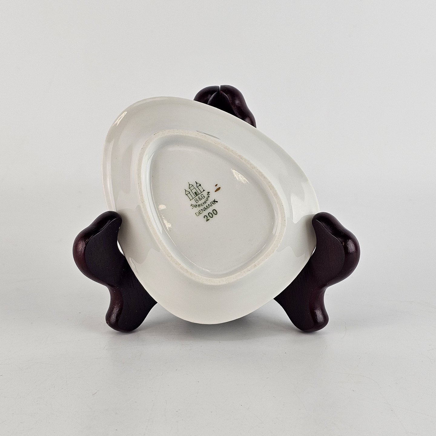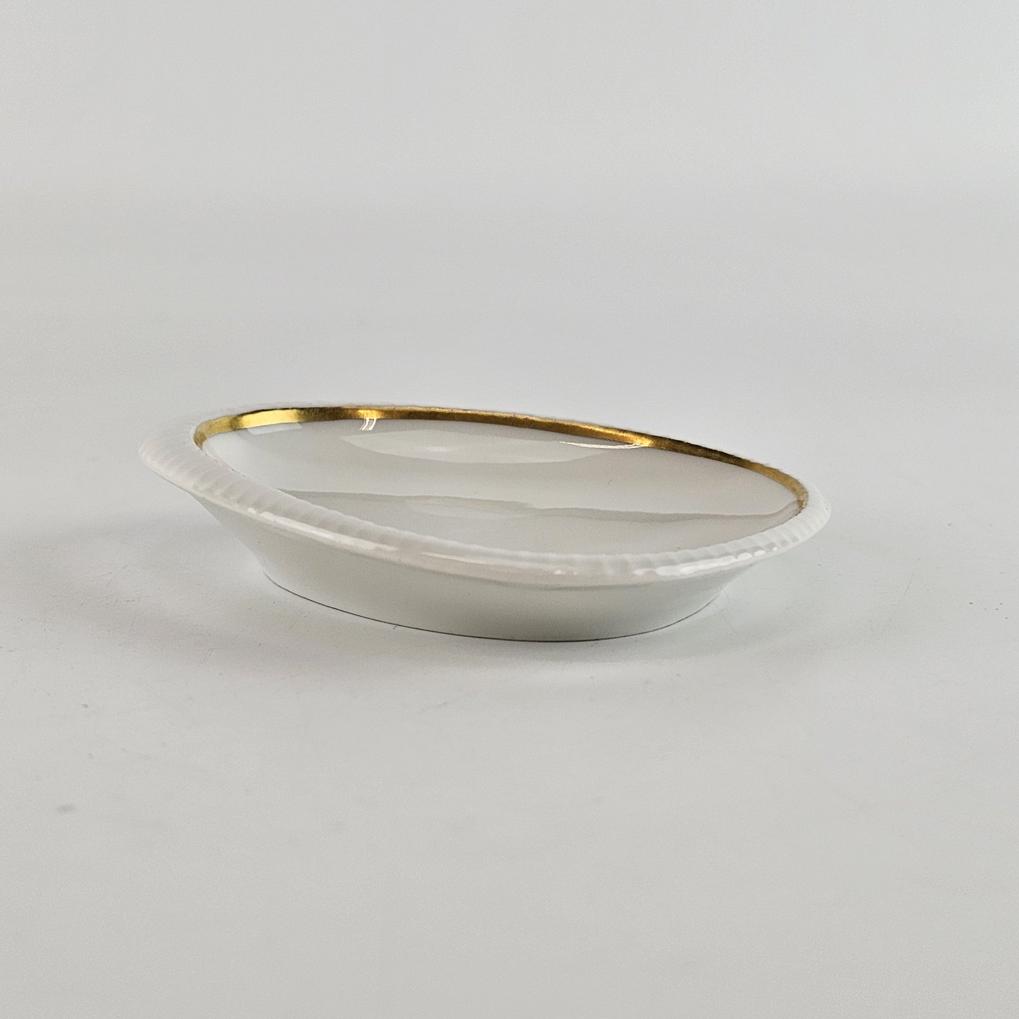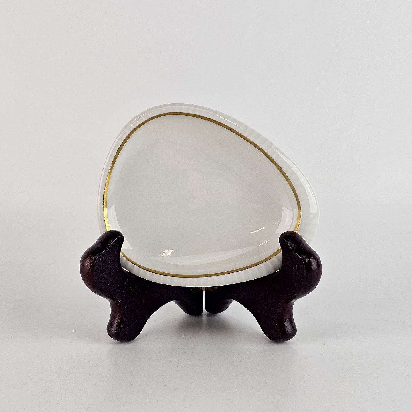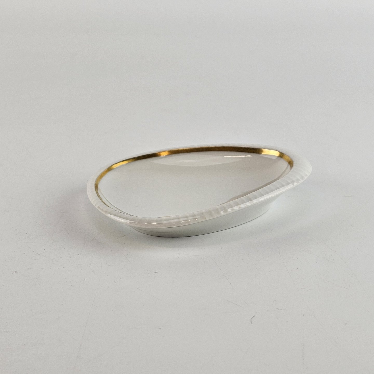 Vega er hvidt porcelæn med guldkant. Tallerkener og fade er dekoreret med riller i kanten. Kan fremstår med brugsspor