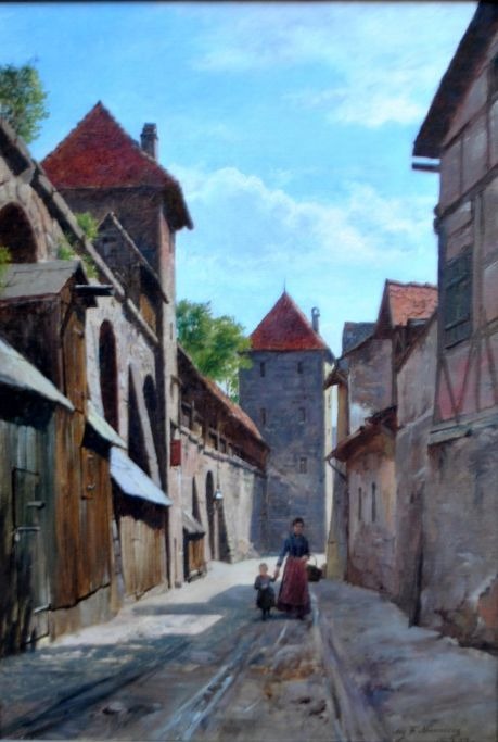 Fischer, August (1854 - 1921) Danmark: Gadescene, Nürnberg, Tyskland.