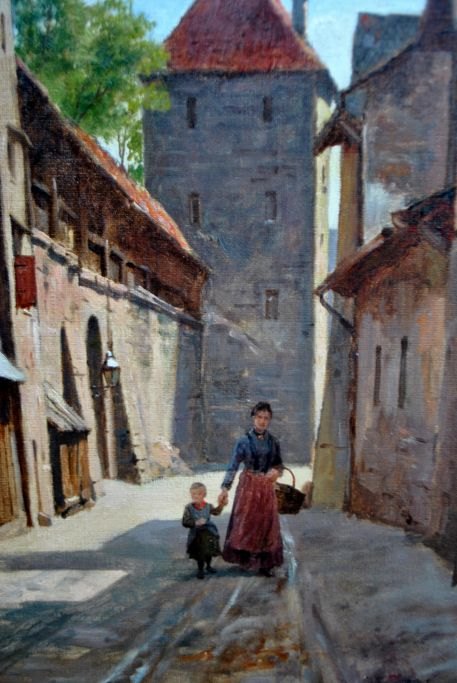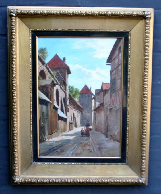 Fischer, August (1854 - 1921) Danmark: Gadescene, Nürnberg, Tyskland. Olie på lærred. Signeret: Aug. F. Nürnberg 15 - 7 - 1892. 60 x 41 cm.