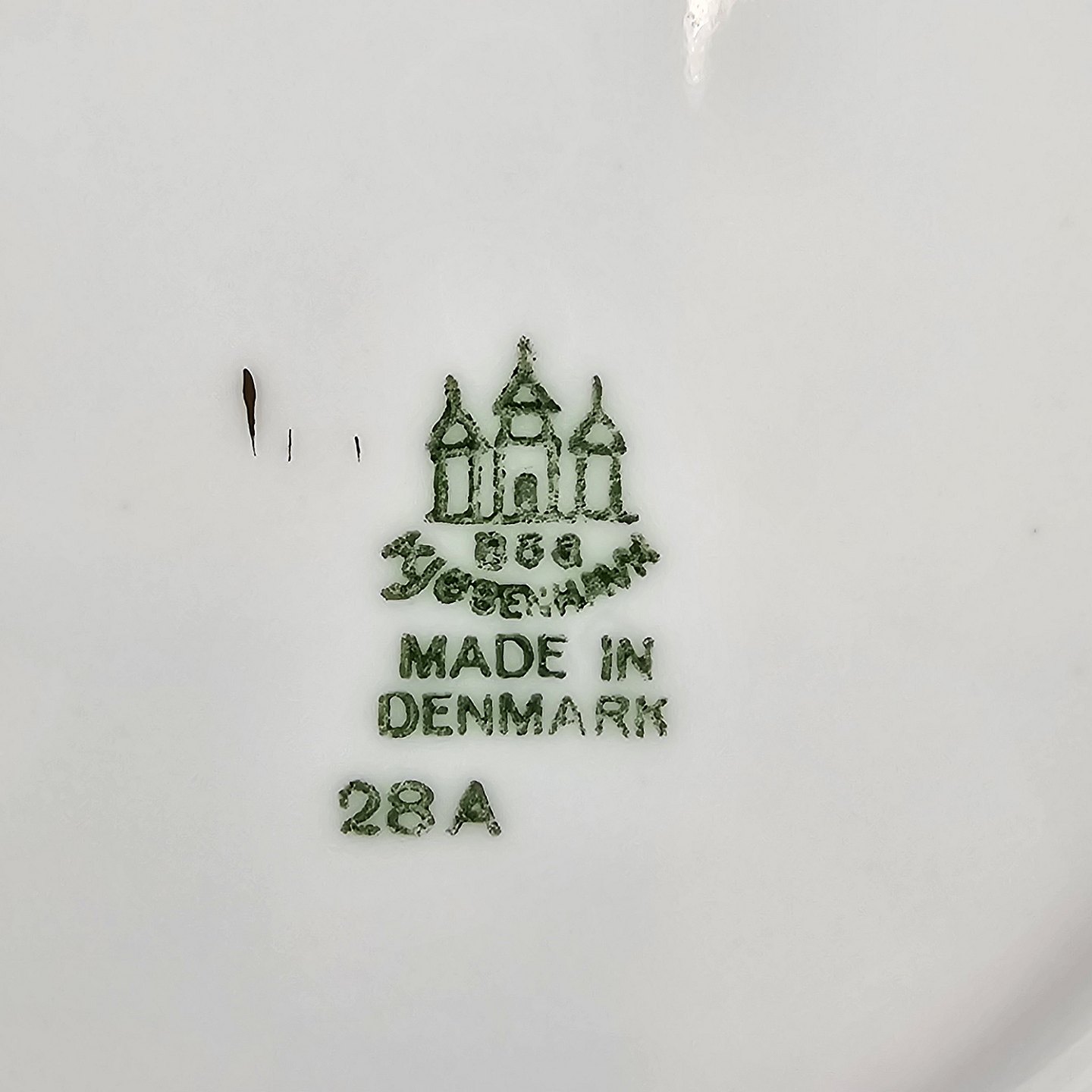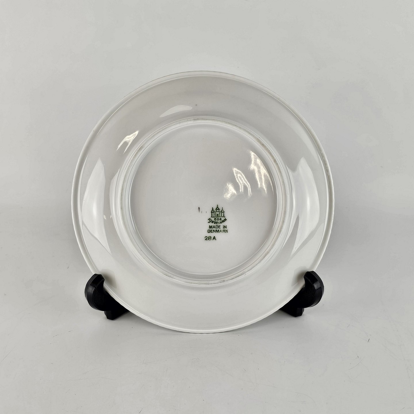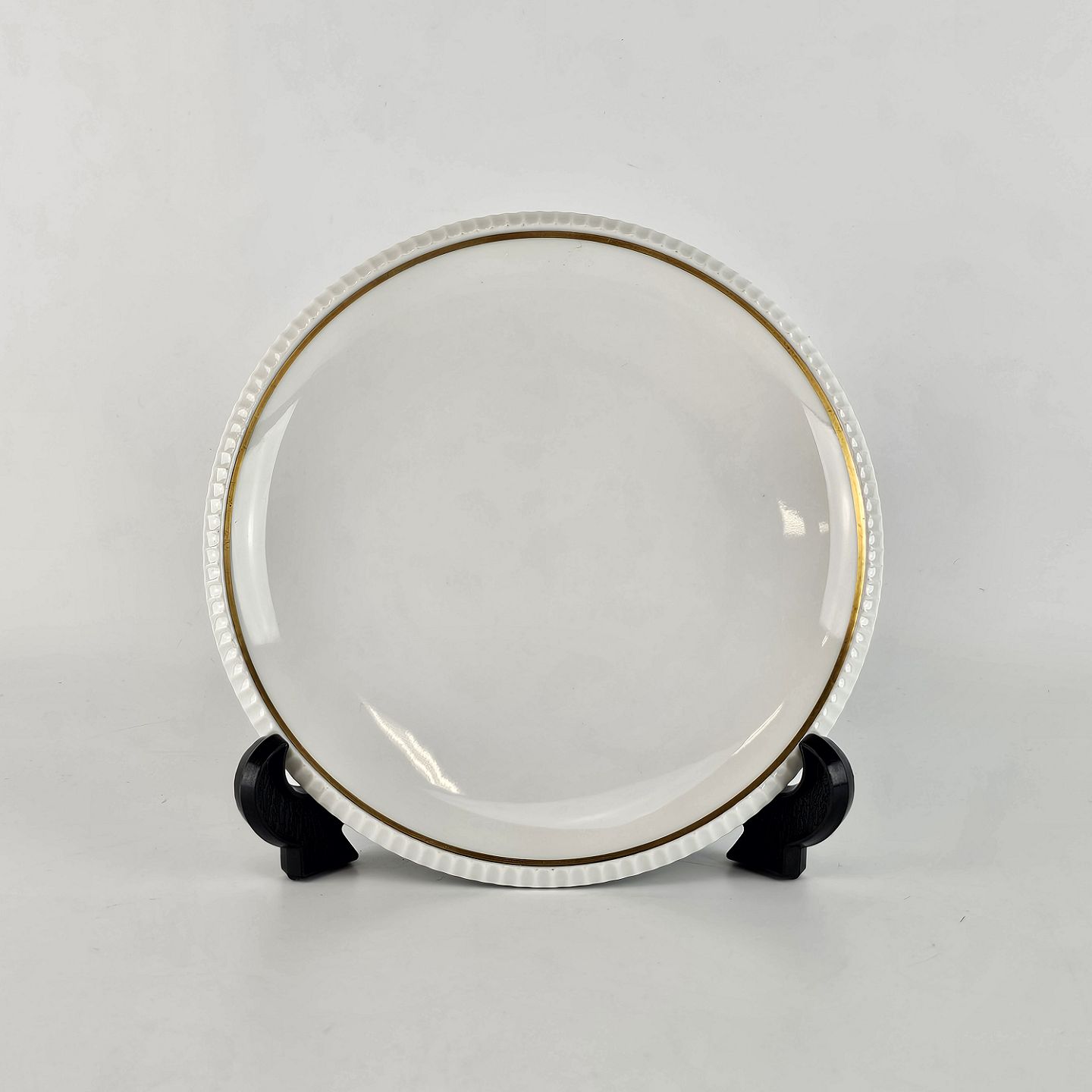 Vega er hvidt porcelæn med guldkant. Tallerkener og fade er dekoreret med riller i kanten. Kan fremstår med brugsspor