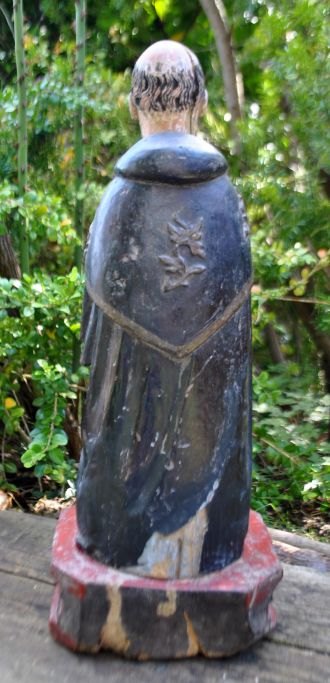 Katolsk helgenfigur - en munk, 19. årh. Udskåret bemalet træ. Med forgyldninger. I hånden holder han en fane. På rødmalet fodstykke. H. 42,5 cm.