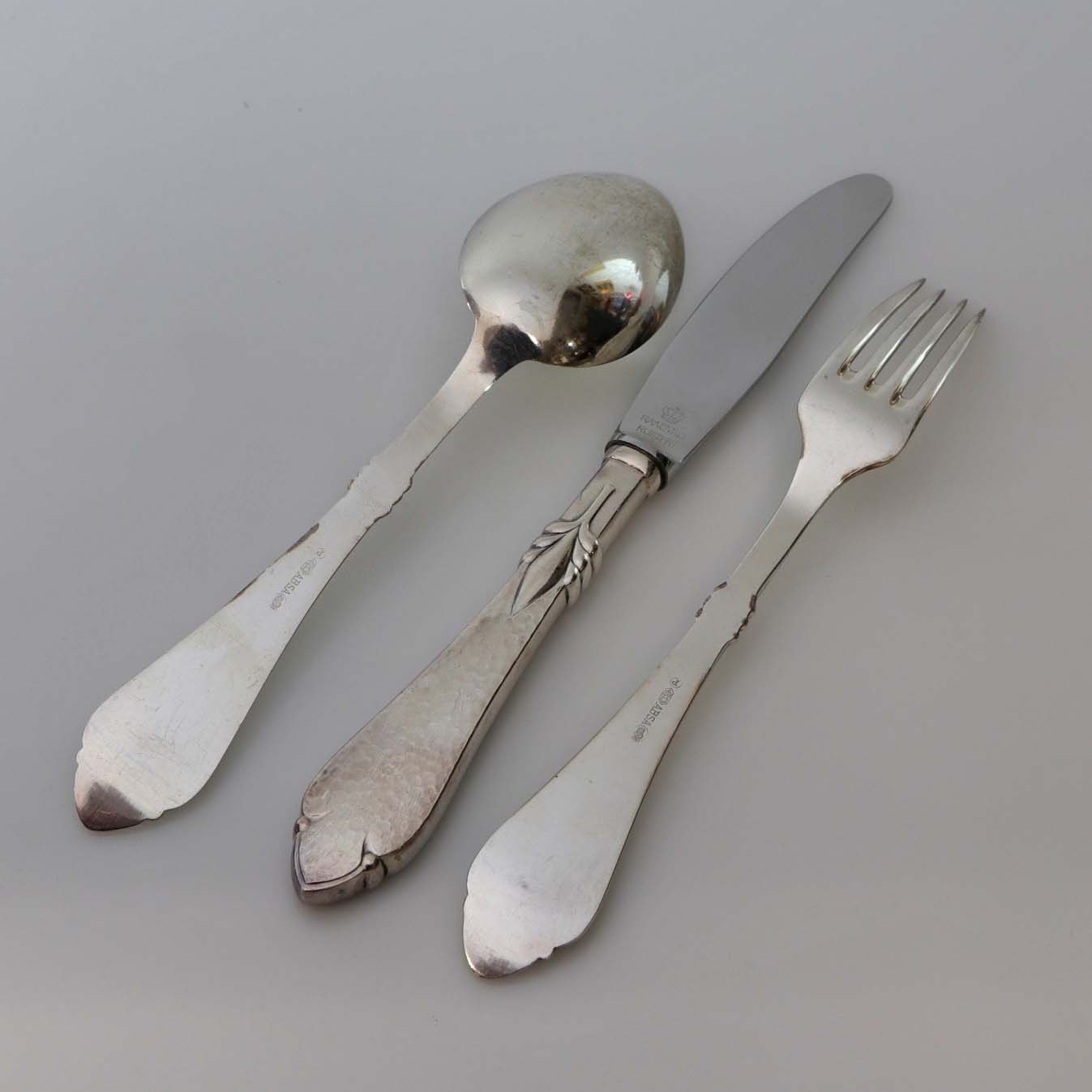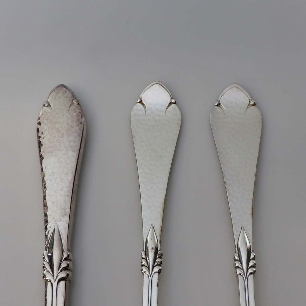 Text zugänglich auf Dänische: Bestik i banket pletsølv med liljeformet motiv navngivet Freja