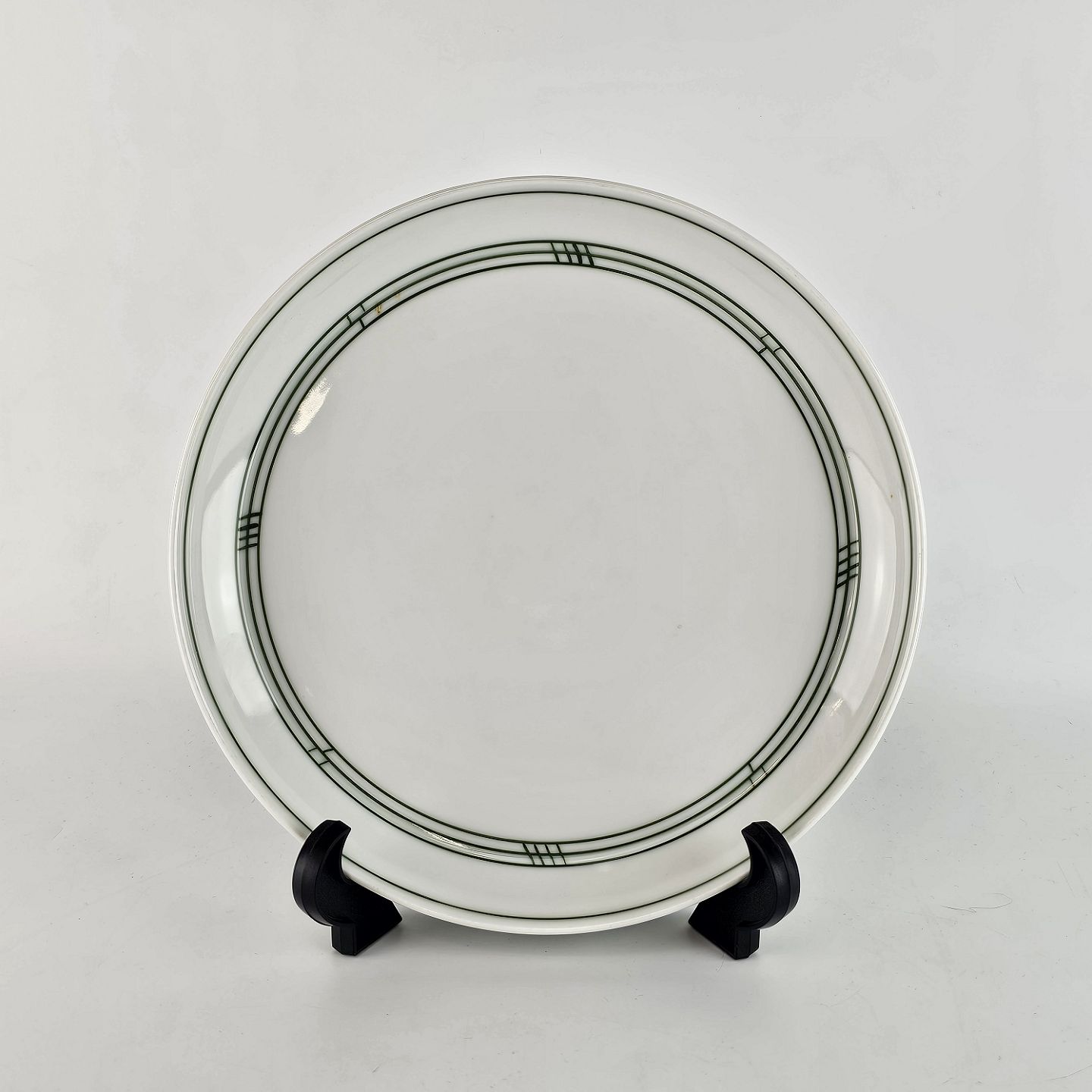 Olympia er hvidt glaseret porcelæn, dekoreret med tynde grønne striber. Lettere brugsspor kan forekomme.