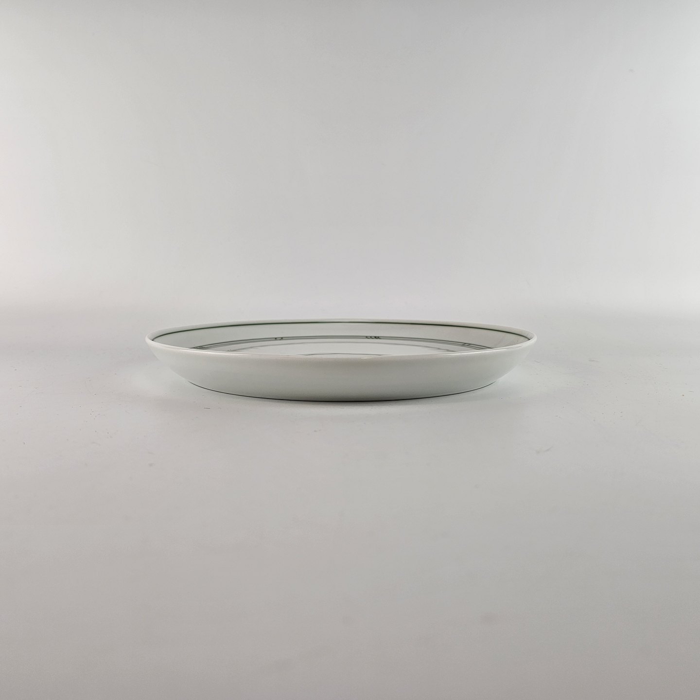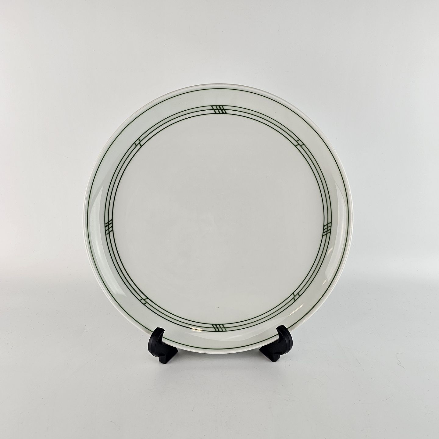 Olympia er hvidt glaseret porcelæn, dekoreret med tynde grønne striber. Lettere brugsspor kan forekomme.