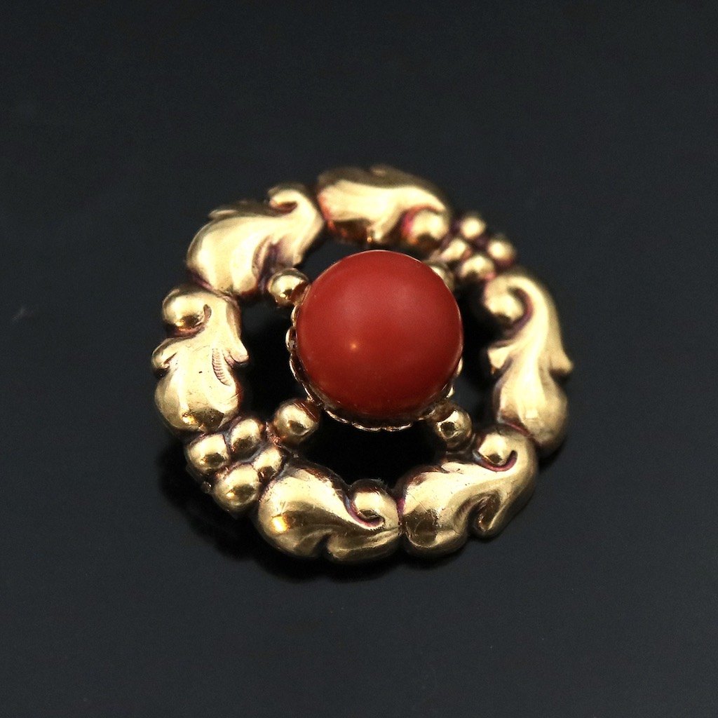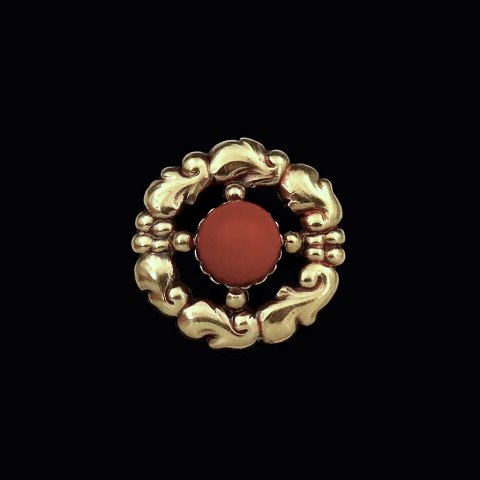 Evald Nielsen. Skønvirke Broche i 14k guld med koral.