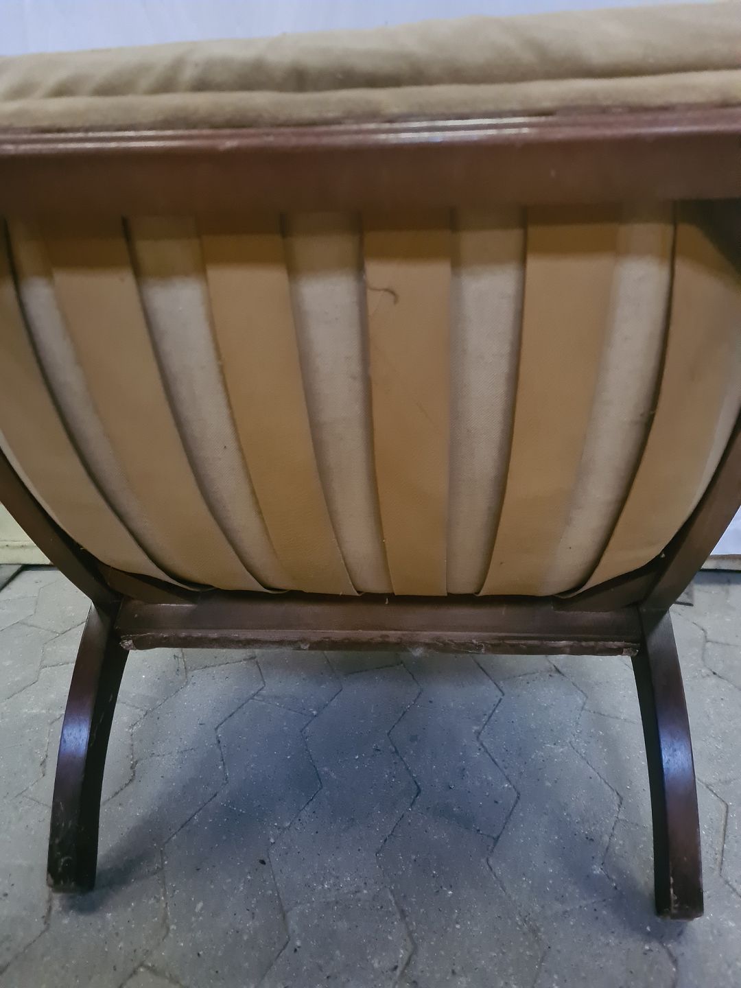 Lænestol i mahogni med velourbetræk, fra 1980erne.
