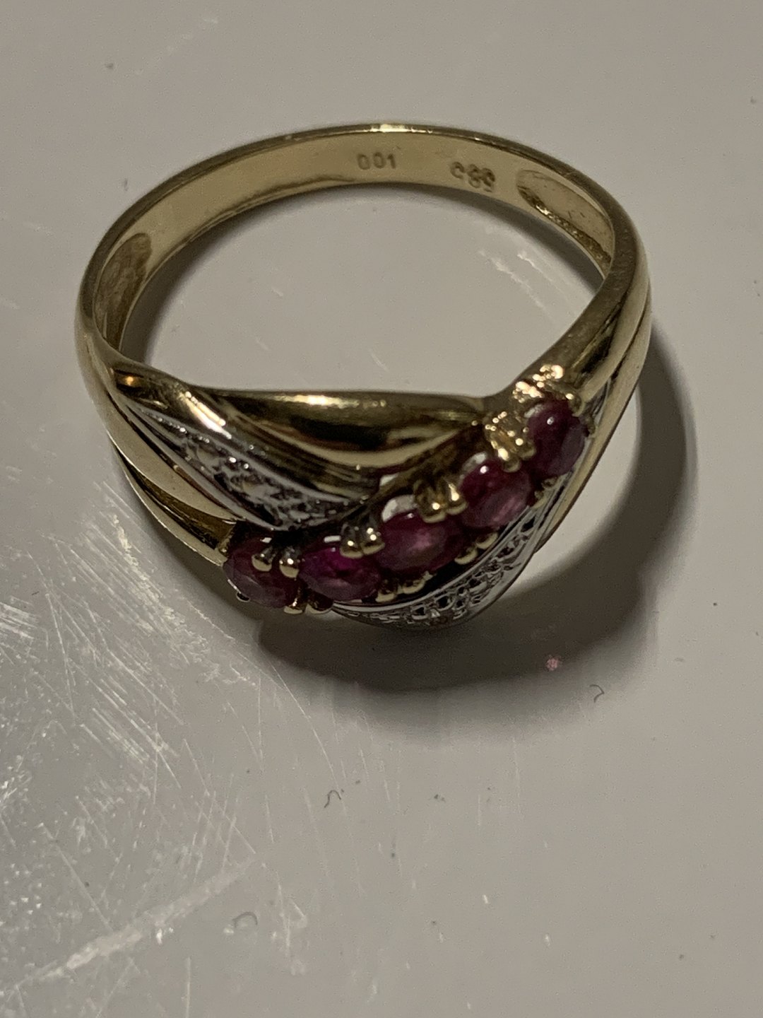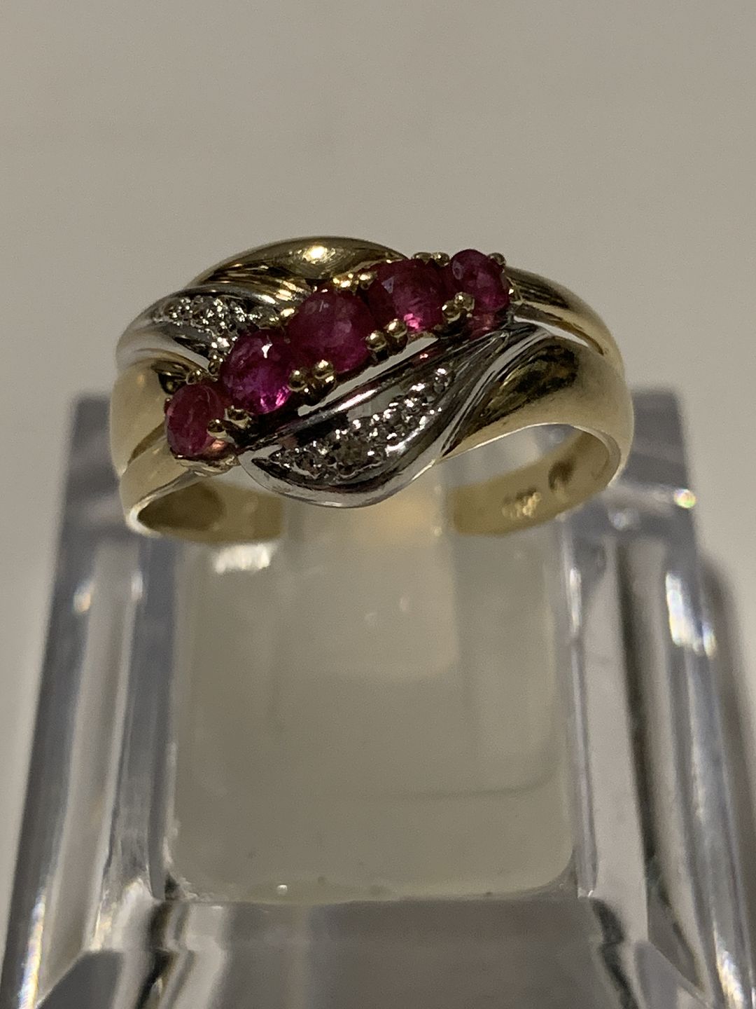 Flot Damering, med fem røde rubiner samt indlagte diamanter, i 14 karat guld.