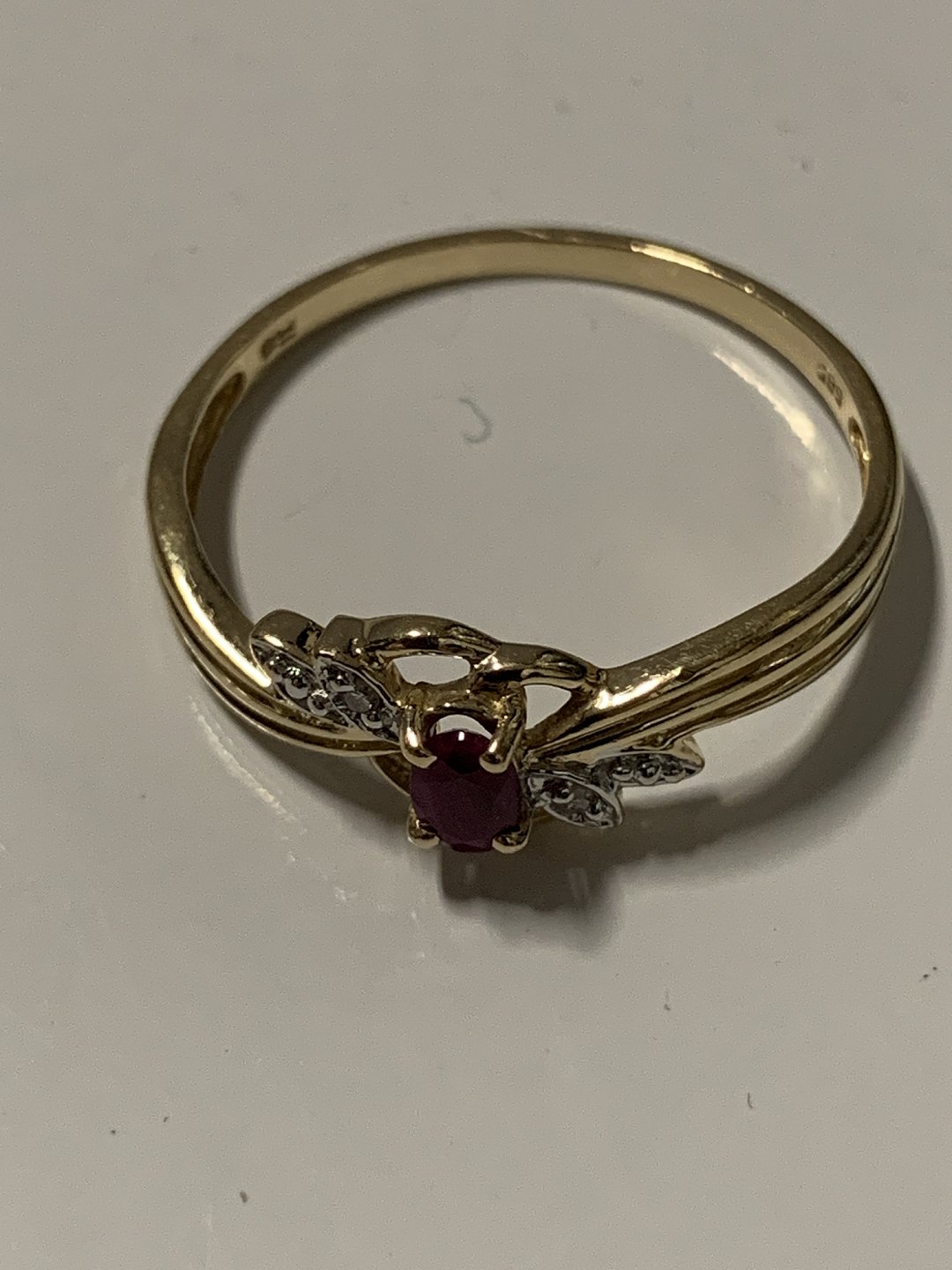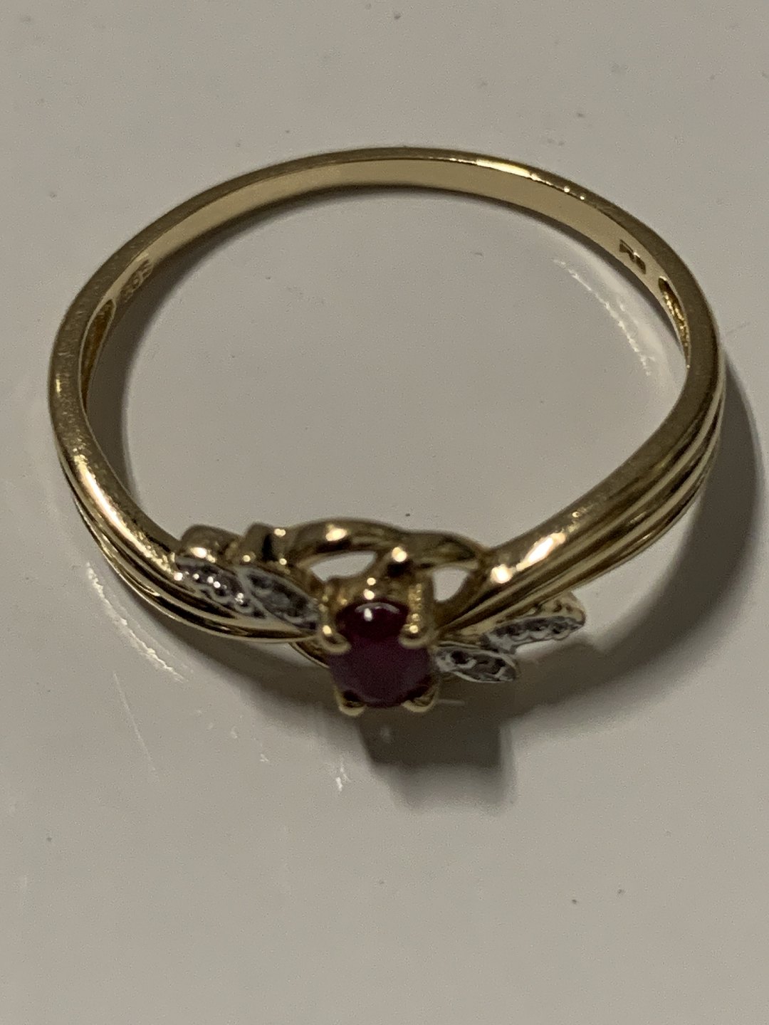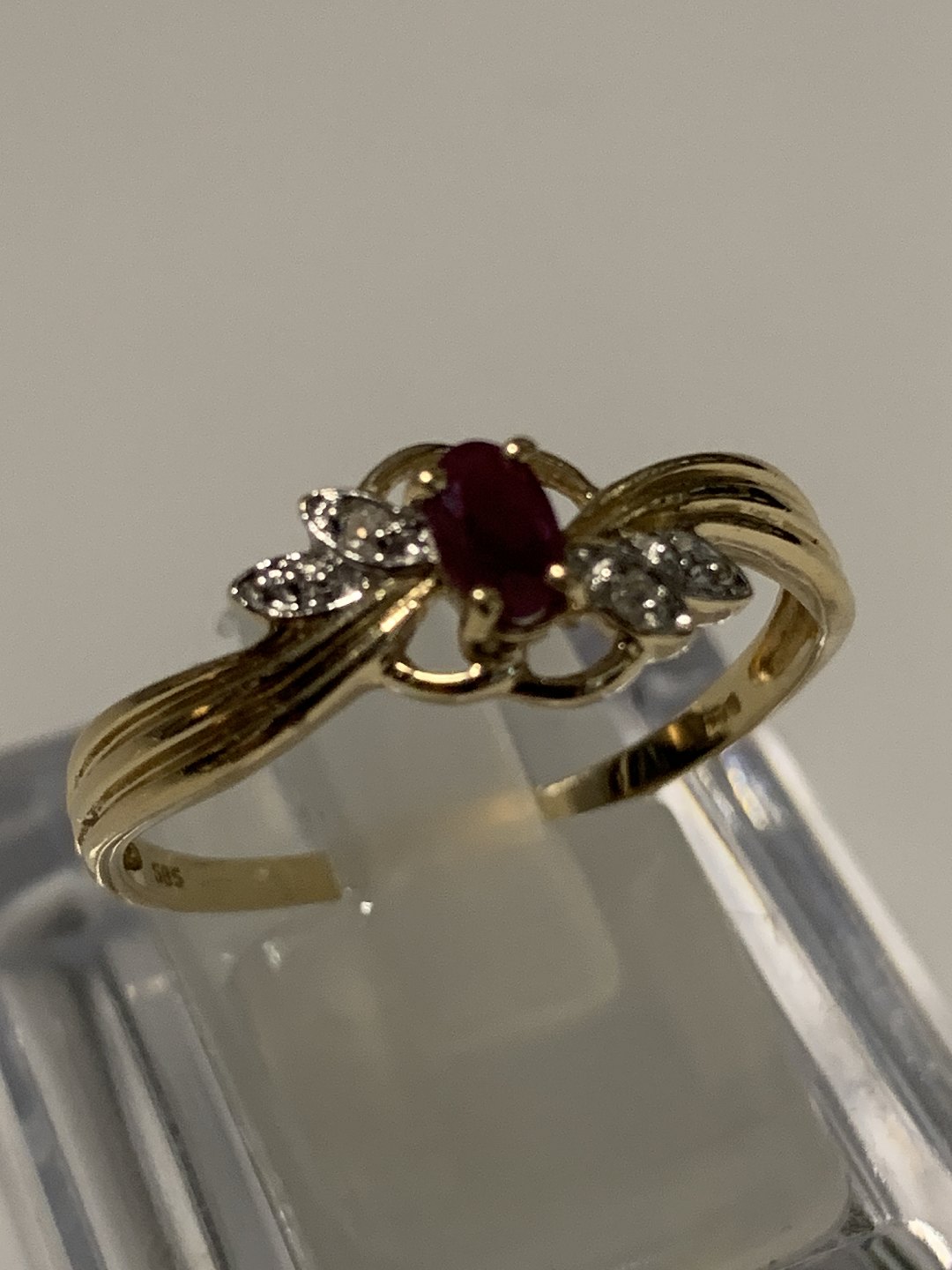 Flot Damering, med en rød rubin samt indlagte diamanter, i 14 karat guld.