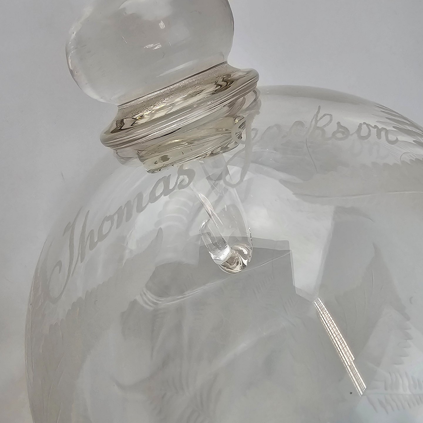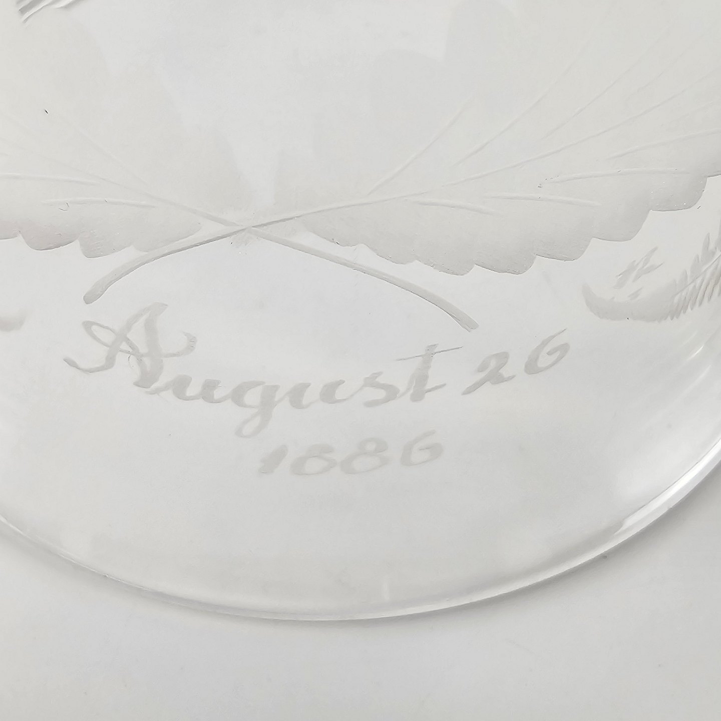 Glasklokke med krog indeni. Dekoreret med indgraverede blade og teksten August 26 1886, Thomas Jackson