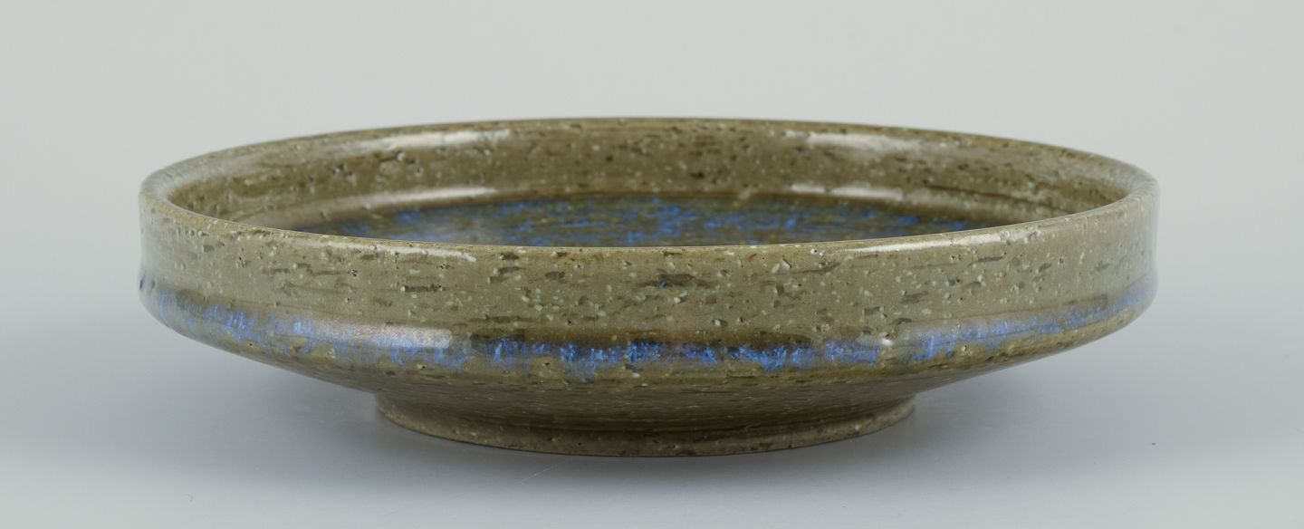 Fad i keramik med glasur i grønne og blå toner.