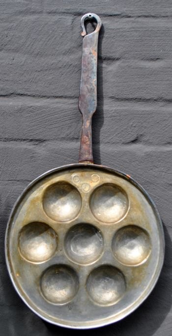 Dansk æbleskive pande, 19. årh. indvendig fortinnet. Med skæft i jern. Stemplet: J.S. L: 50 cm. Dia.: 26 cm.