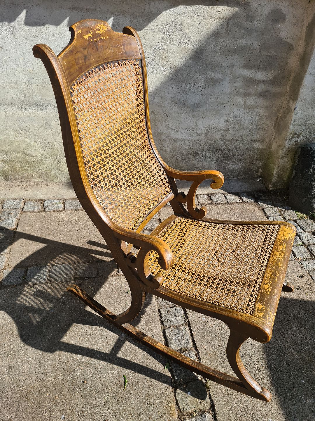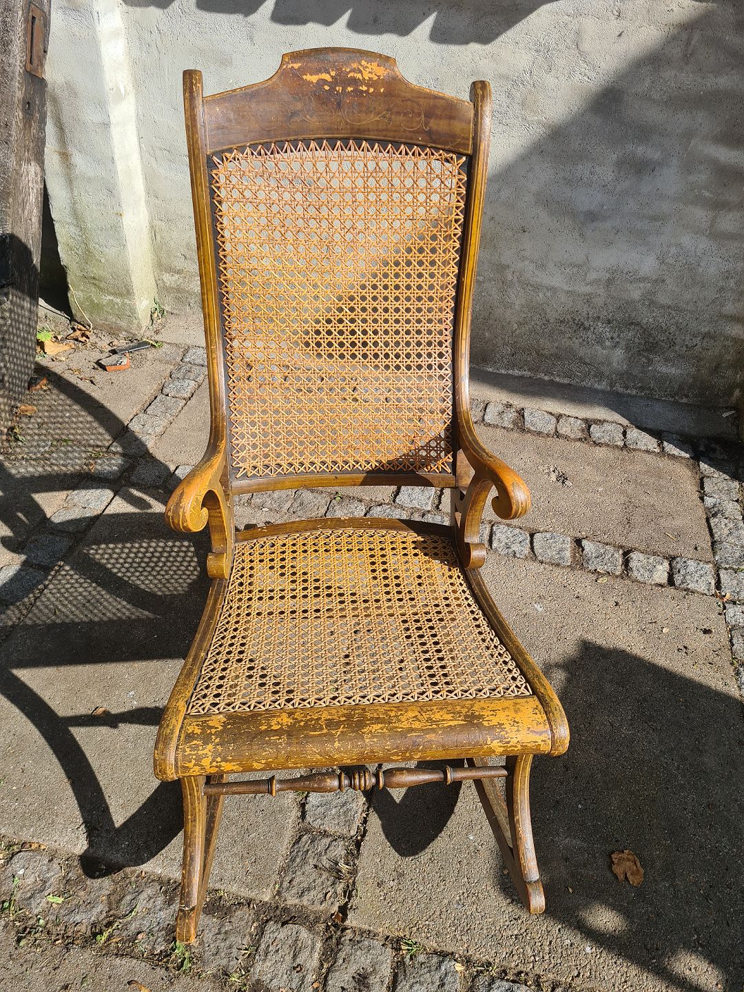 Gyngestol fra starten af 1900 tallet i fyr og med rørflet. Fremstår pæn og velholdt uden skader på rørfletten. Dog en smule slid på træet ved sæde og armlæn.