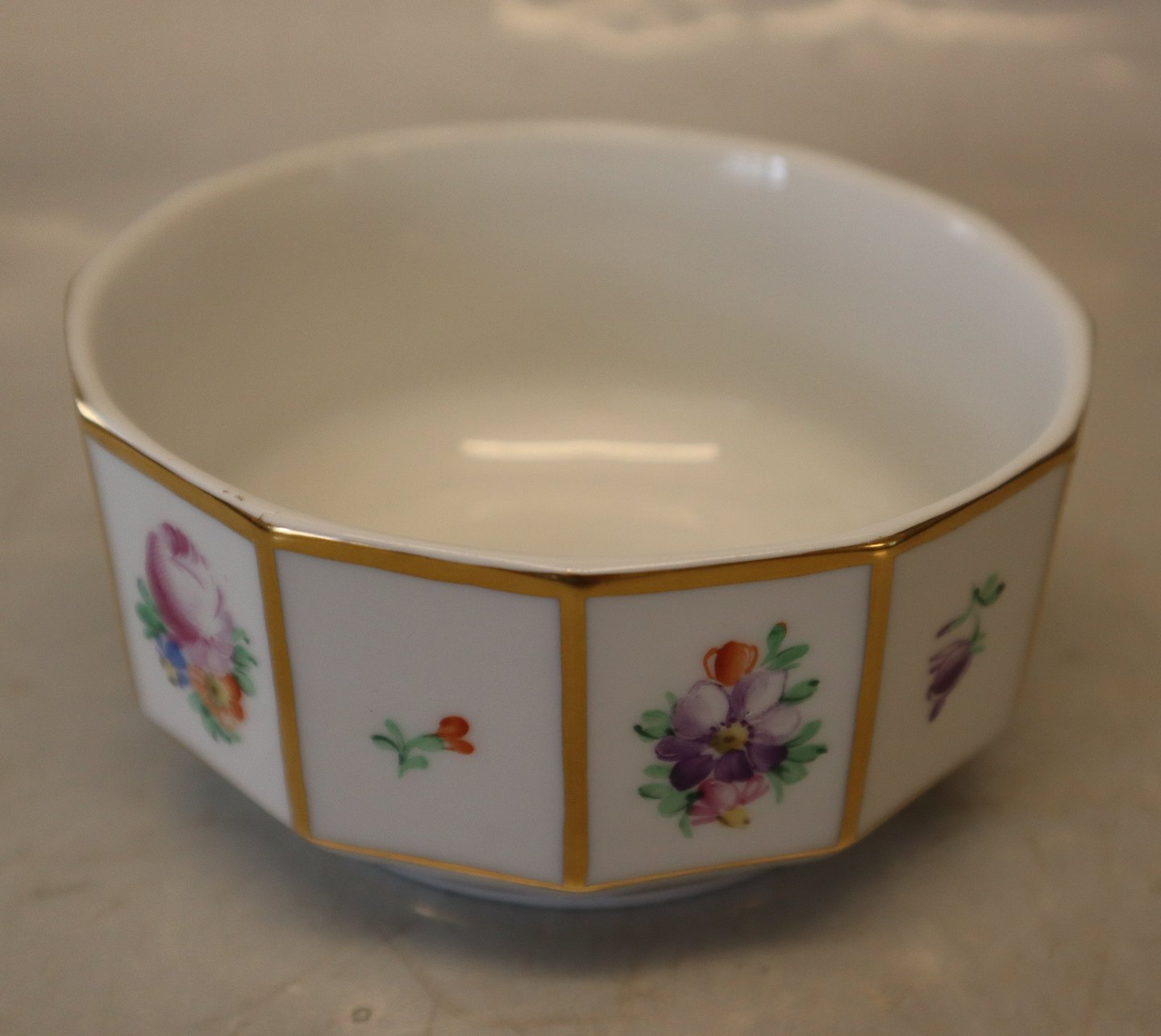 8572-444 Marmeladeskål med hul til ske 11 x 13 cm Kgl. Henriette # 444 Håndmalet spise- og kaffestel fra Den kongelige Porcelænsfabrik med strøblomster . I fin og hel stand