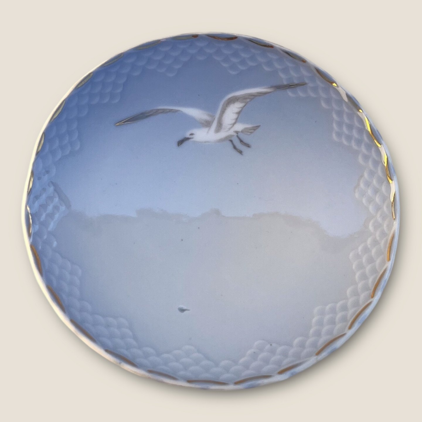 | Bing & Grøndahl, Måge med guld, Lille opsats, 12cm i diameter, 6,5cm høj, 2.sortering *Med glasurfejl og ujævnhed på kant og fod*
