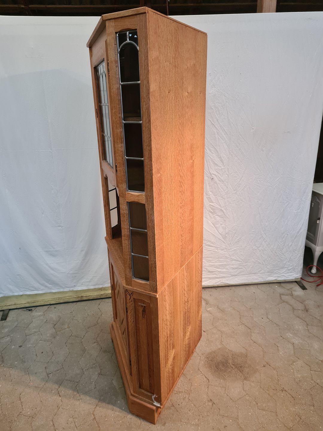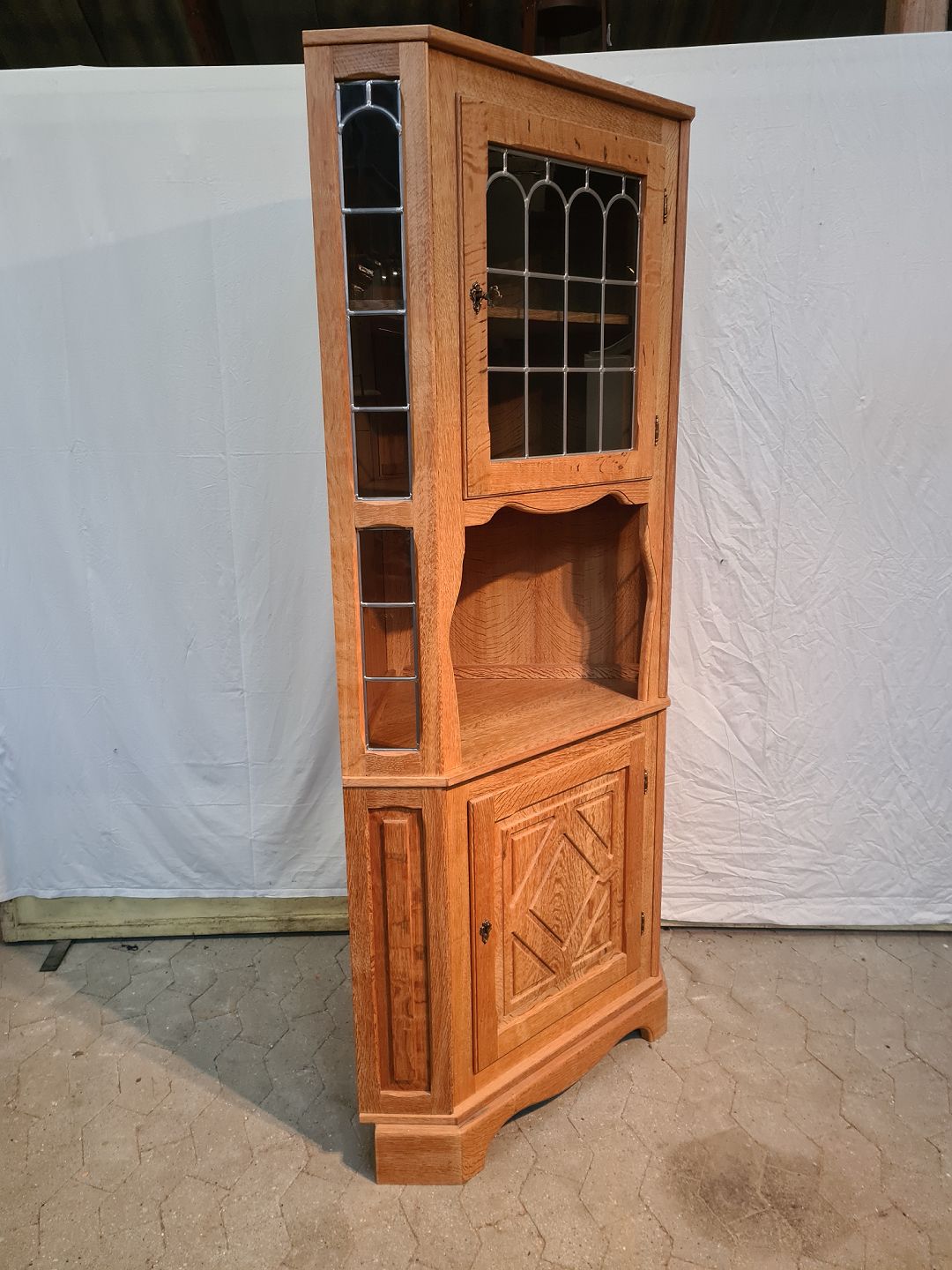 Hjørneskab i fineret egetræ, fra 1980erne.