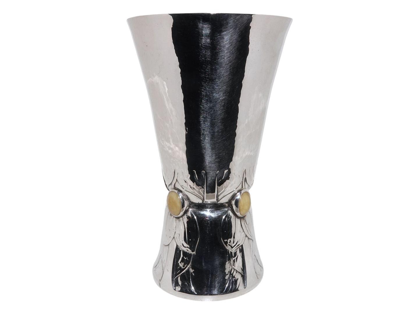 Georg Jensen silver, large and very early vase with four pieces of milk amber.
