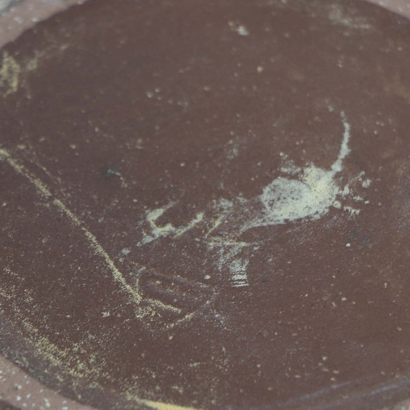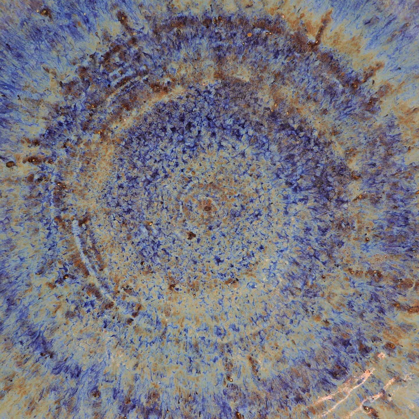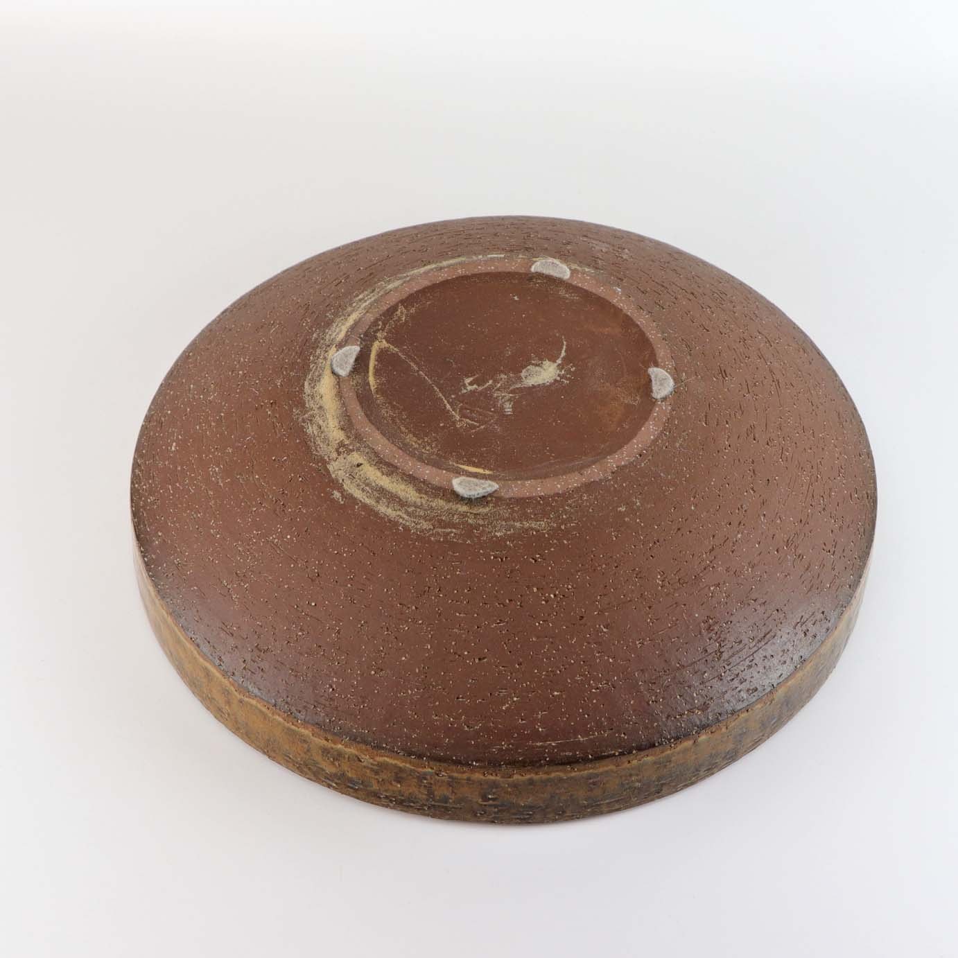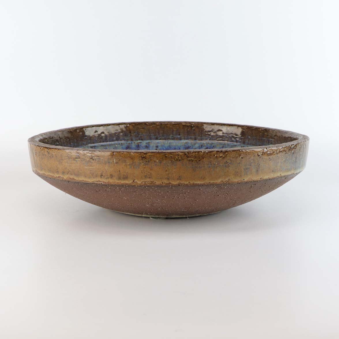 Stor skål i keramik med blå glasur på brunt lertøj