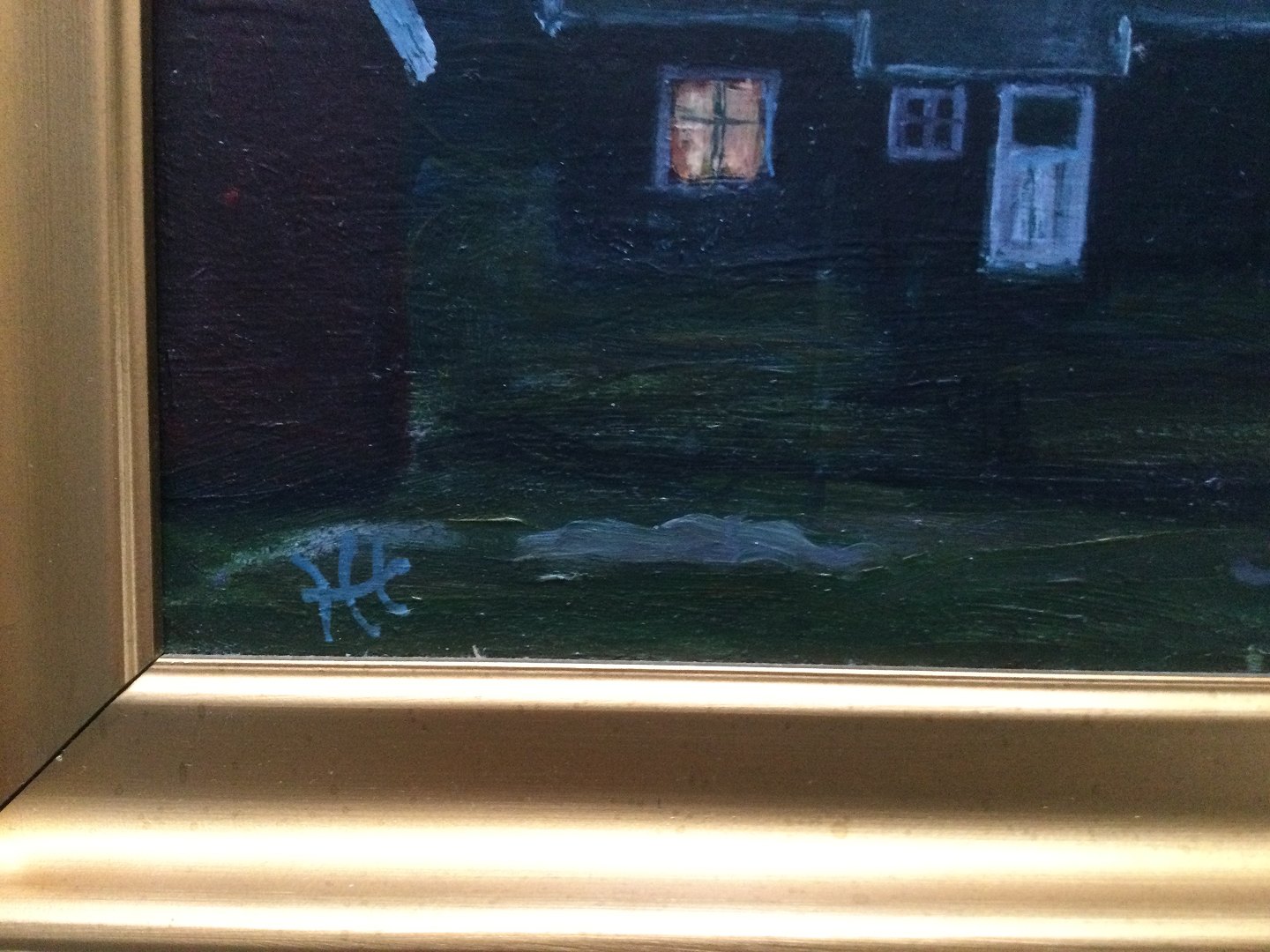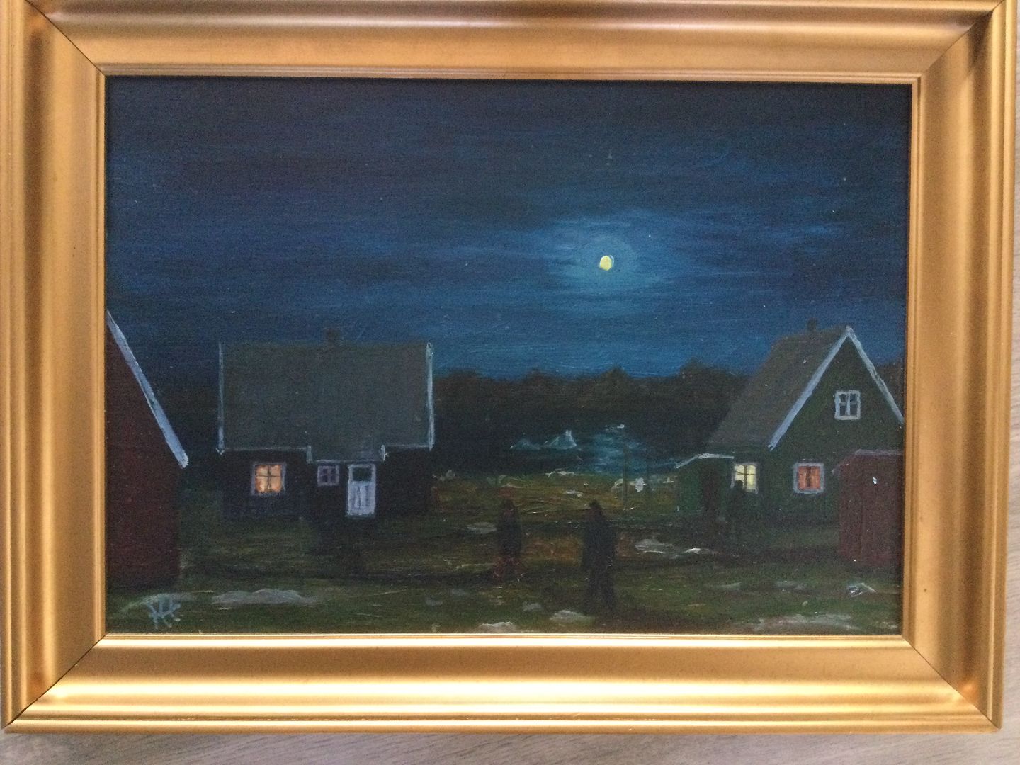 Maleri af Henning Therkildsen - Aftenparti fra Grønlandsk bygd.