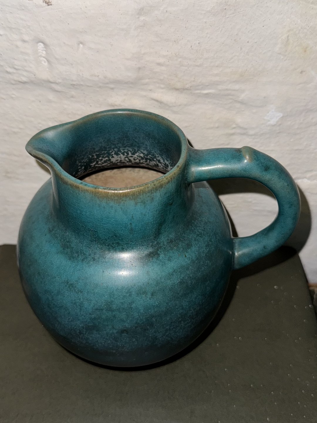 Kande i keramik fra Lauritz Hjorth, Rønne på Bornholm. Fremstillet omkring 1930. Dækket af en smuk turkis glasur. Fremstår i god stand uden skader eller reparationer. Fabriksmærket med fabriksmærket, en Hjort, indstemplet på bunden. H. 15,5 cm