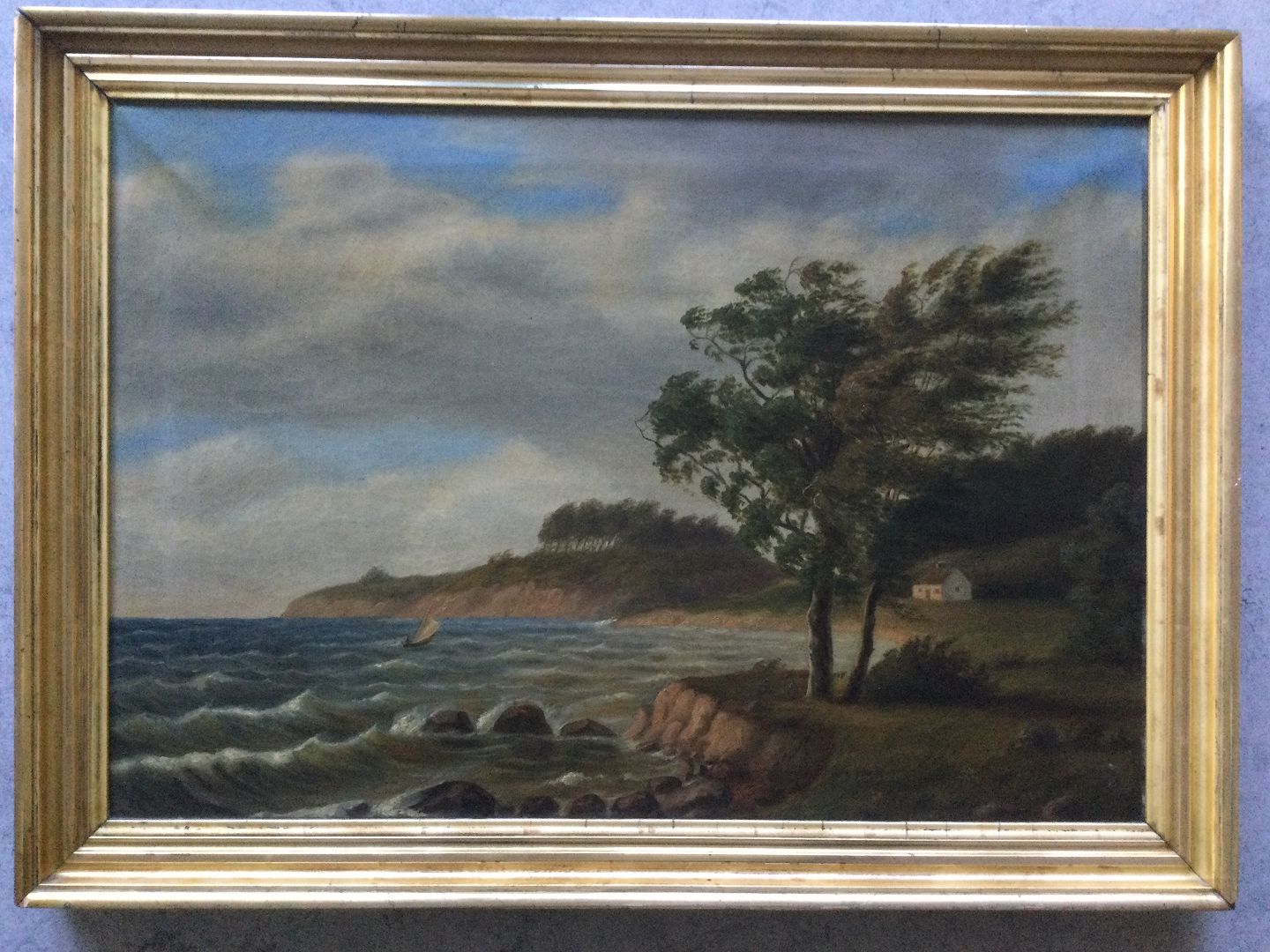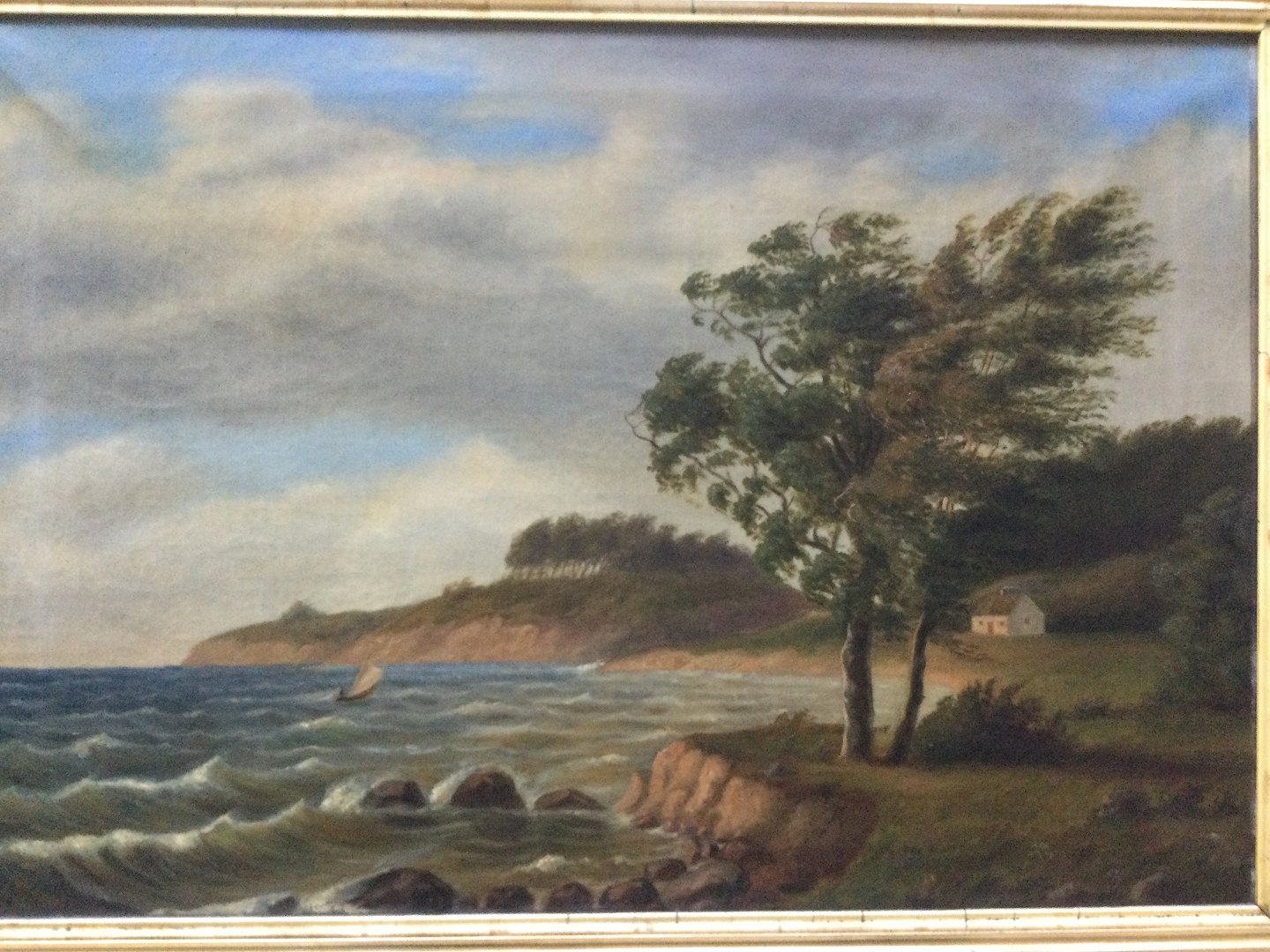 Maleri af Emmery Rondahl - Forblæst kystparti hus hus og båd.